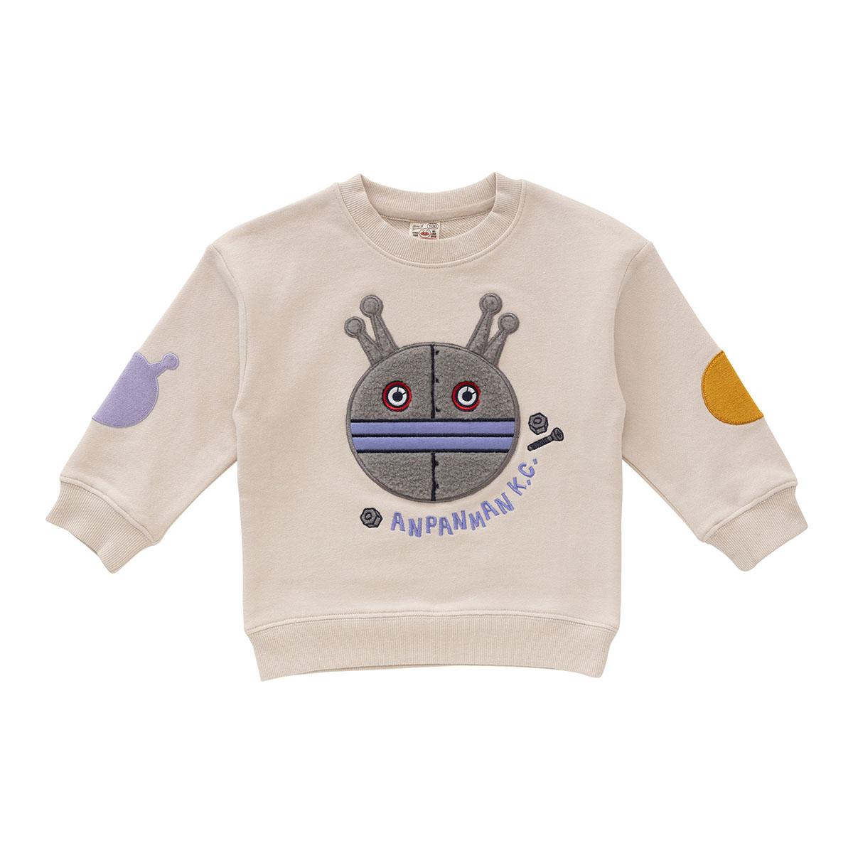 袖にはパッチがついており、グリーンはめいけんチーズとカレーパンマン、ベージュはばいきんまんとドキンちゃんのシルエットデザインです。