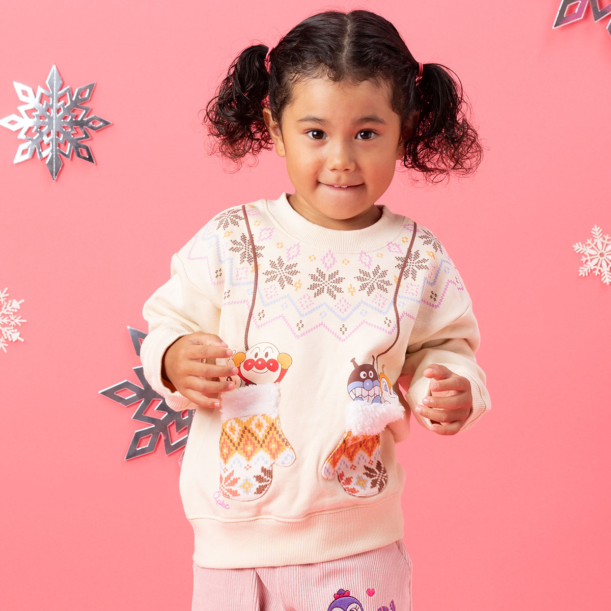 手袋からアンパンマンたちがひょっこり顔を出している遊び心いっぱいのトレーナー。 ミトンの紐は立体的な発泡プリントで表現し、ミトン部分はポケット仕様になっており、思わず触りたくなるかわいいデザインです。