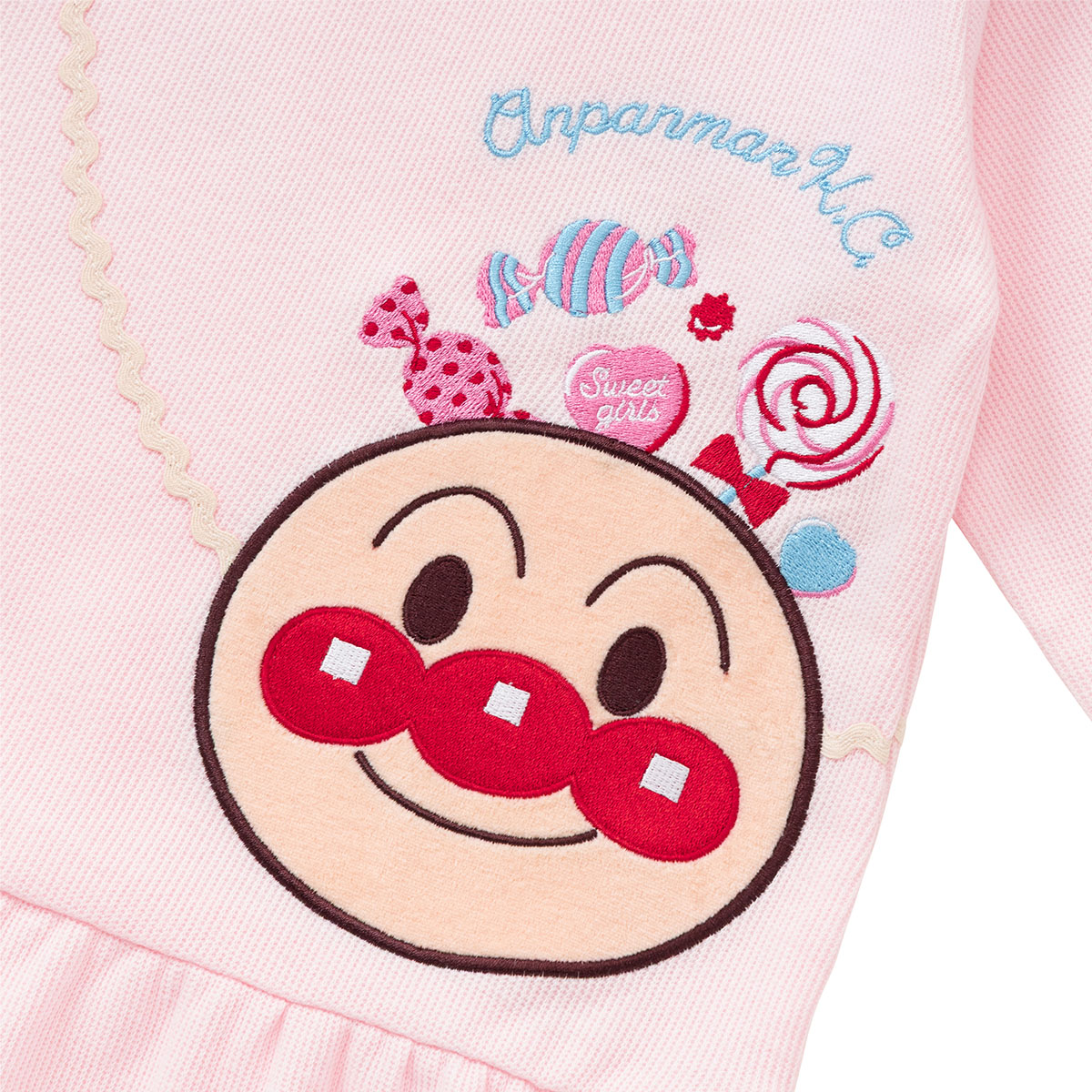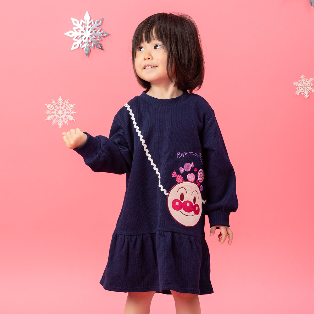 アンパンマンのポシェット風デザインがかわいいワンピース。 お顔部分は肌触りの良いベロア生地のアップリケで、ポシェットから飛び出すお菓子は刺繍で表現されています。
