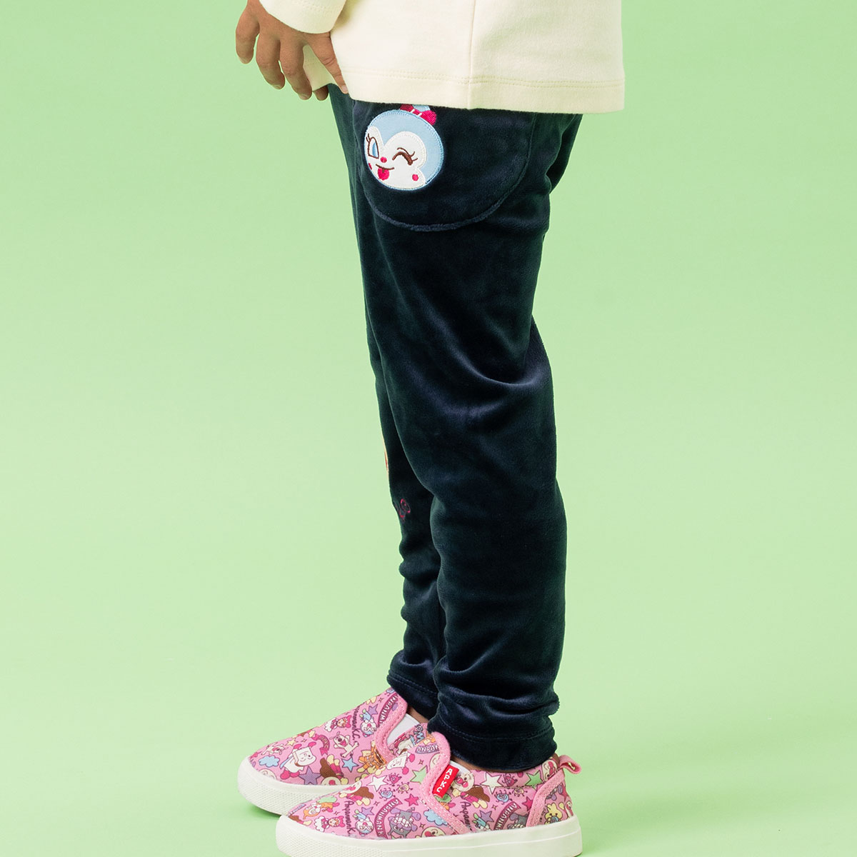 右側にアンパンマン、左ポケットにオフ白配色はドキンちゃん、ネイビー配色はコキンちゃんのお顔アップリケが施されています。