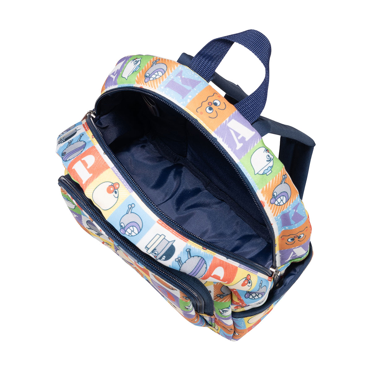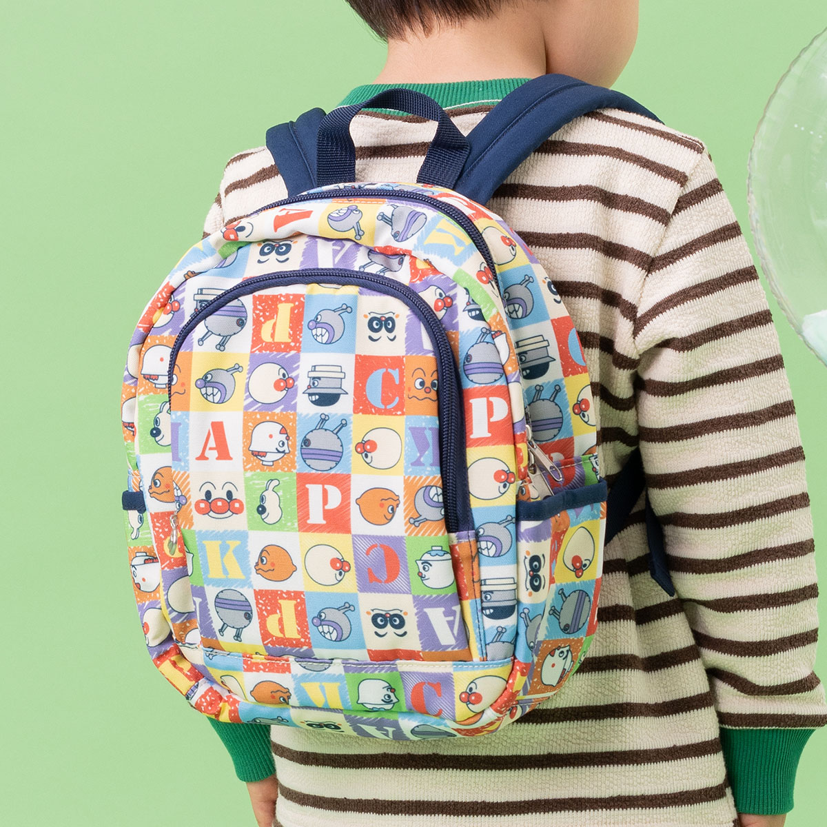 アンパンマンとなかまたちのいろんなお顔がカラフルなブロック風にデザインされた総柄のリュック♪