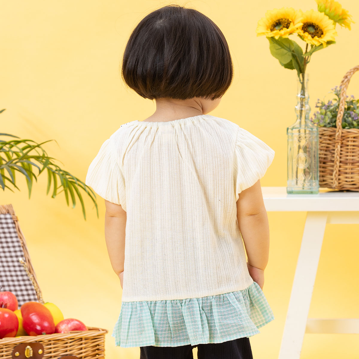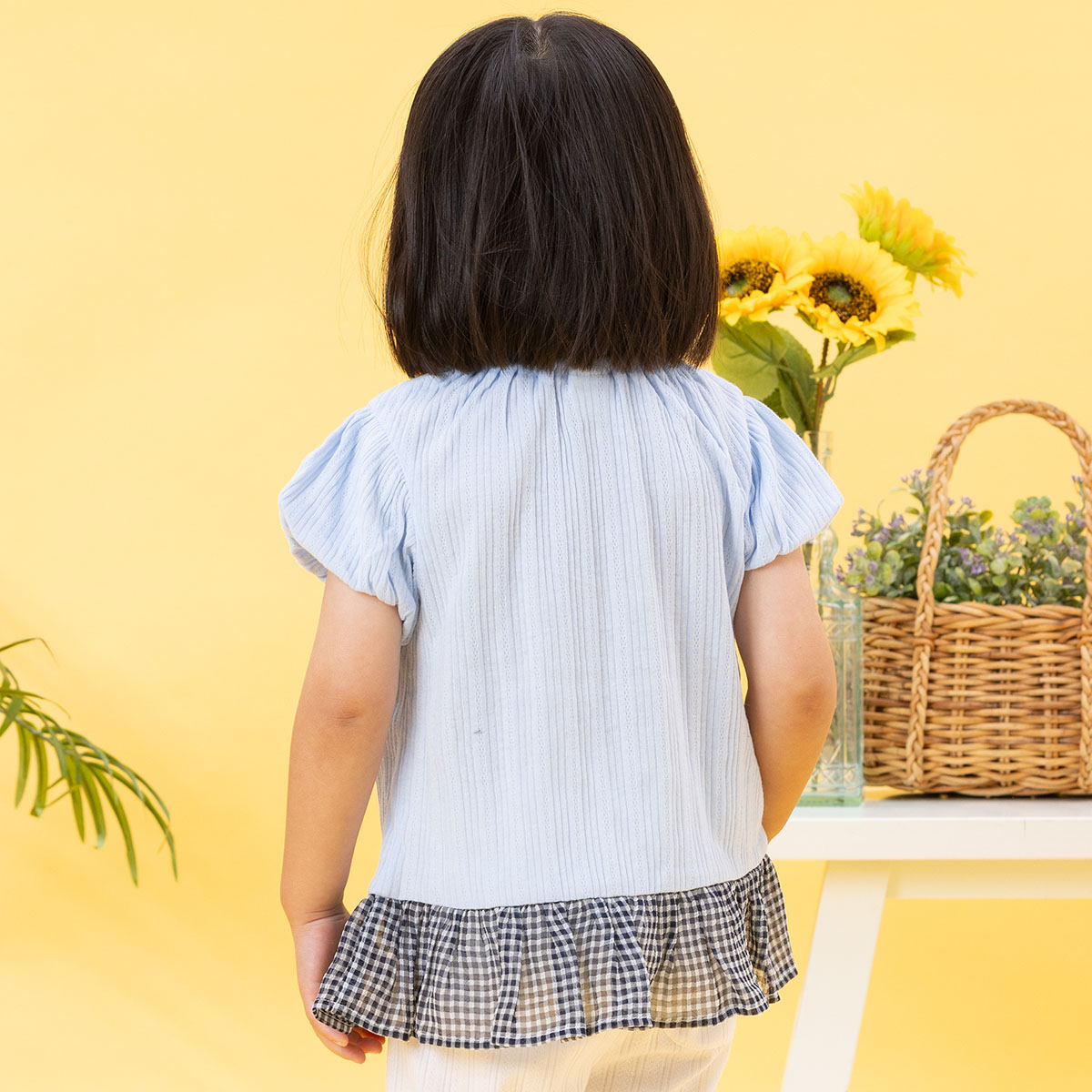裾のフリルやパフスリーブ、ドット柄の丸襟など可愛い要素がぎゅっと詰まった1枚です。