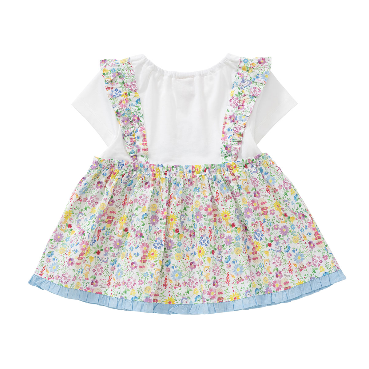 アンパンマン・ドキンちゃん・コキンちゃん・あかちゃんまん・メロンパンナちゃんがお花に囲まれたデザインの総柄がプリントされています。