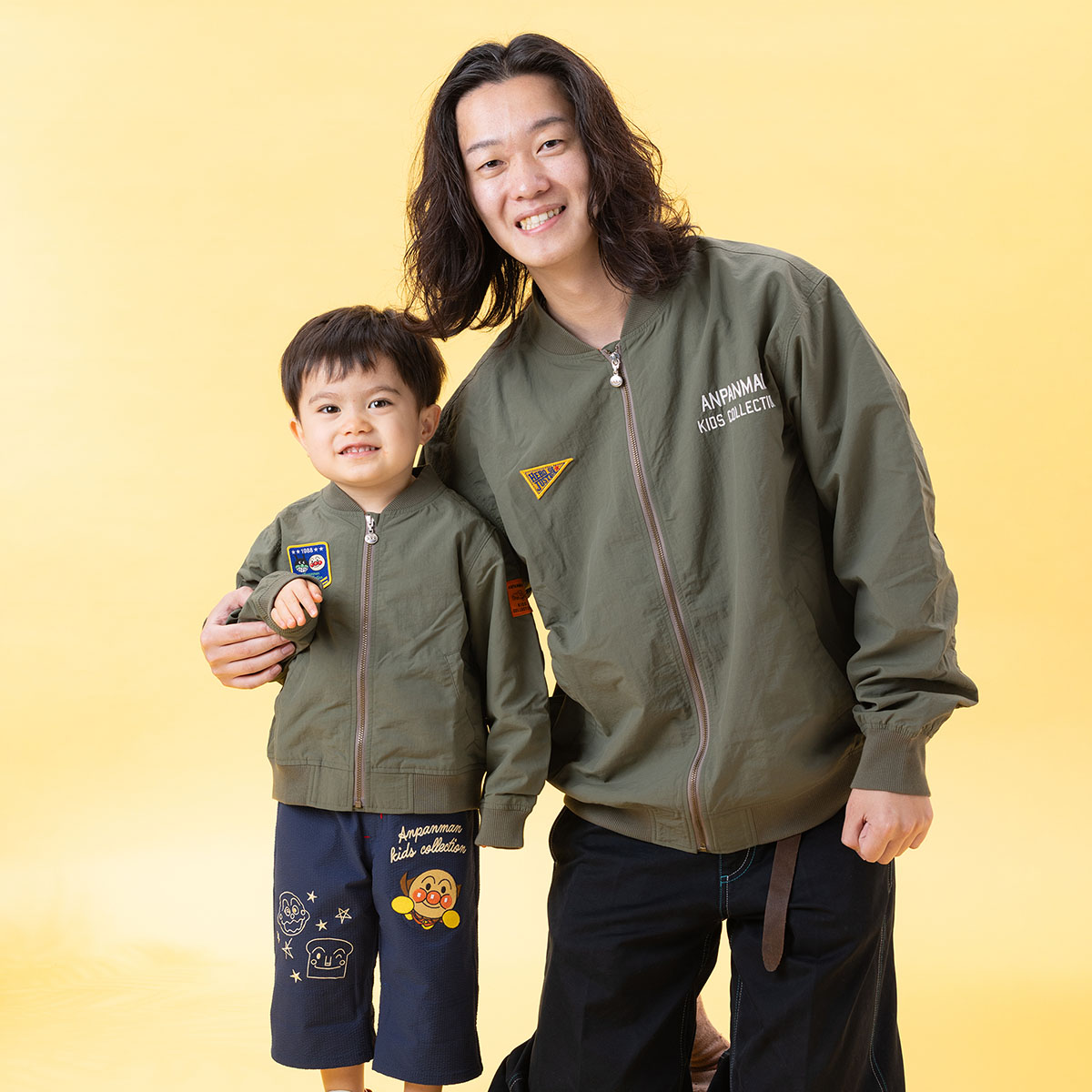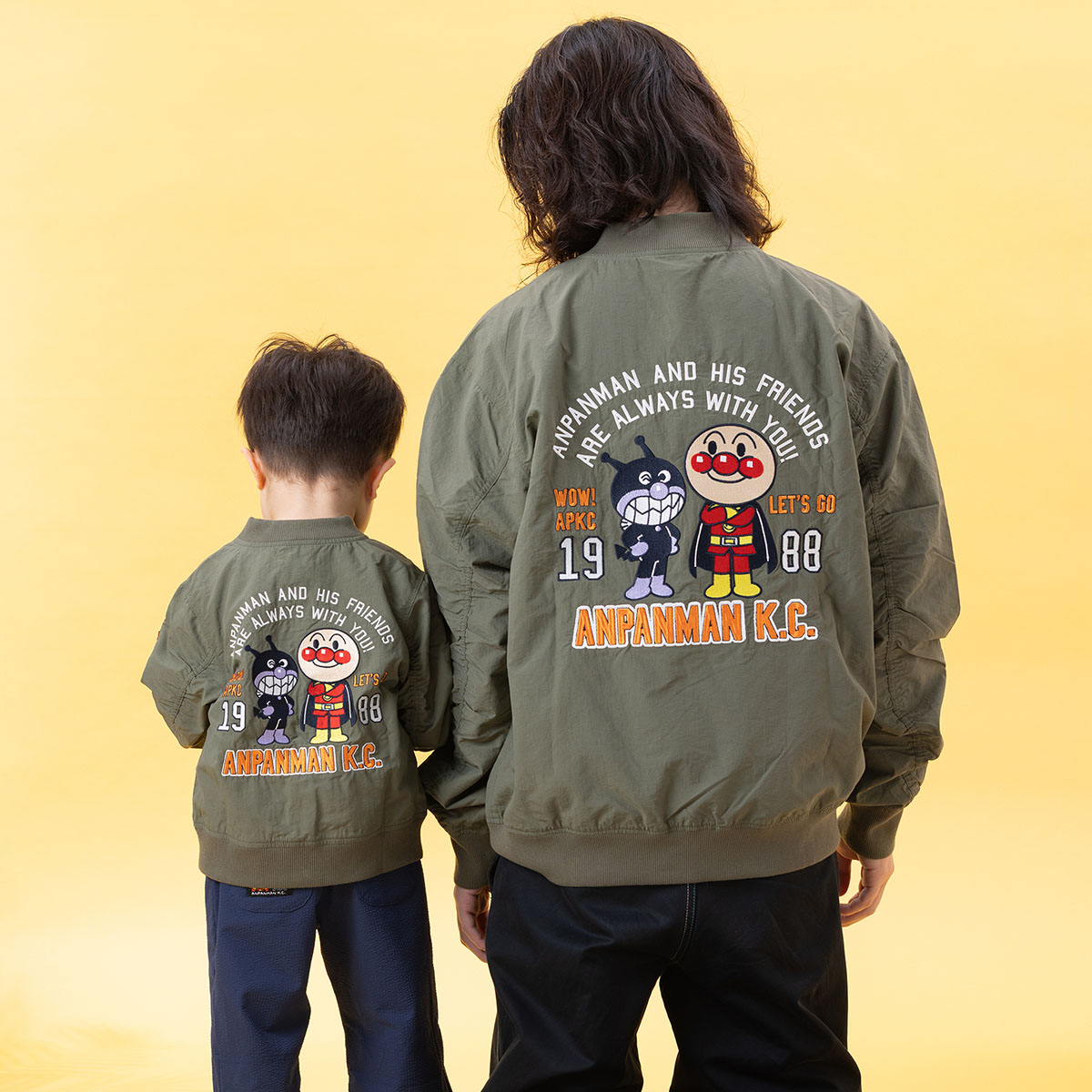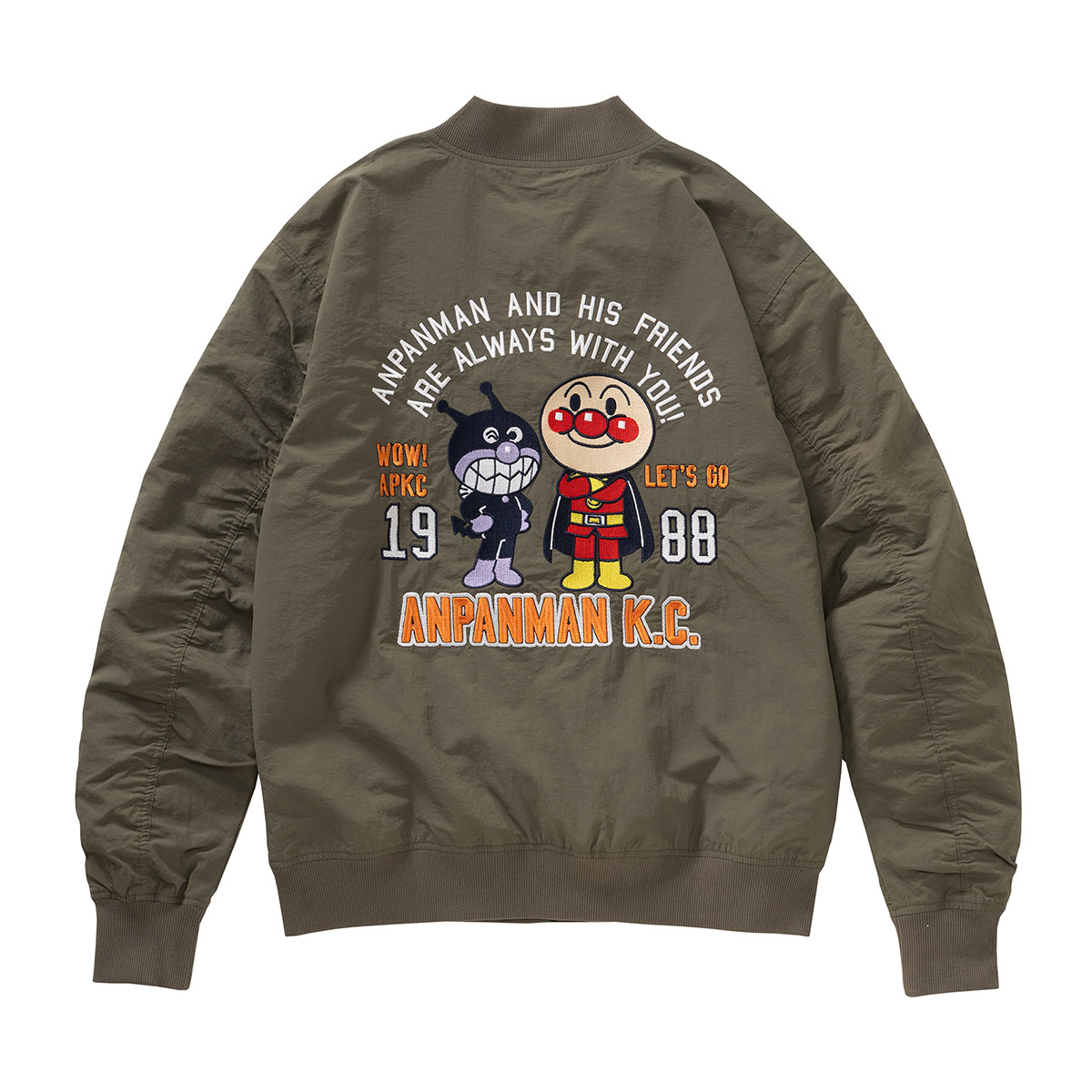バックにアンパンマンとばいきんまんの豪華な刺繍を施した、遊び心あふれるMA-1。