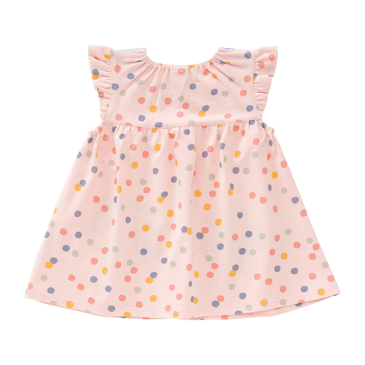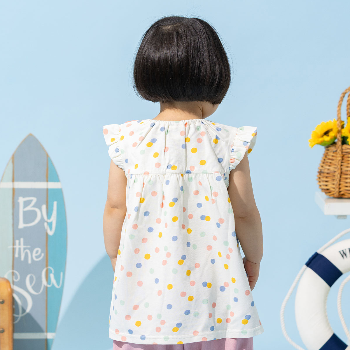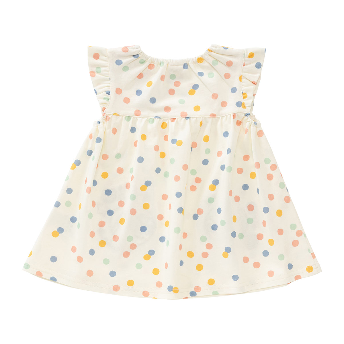 夏らしいカラフルなランダムドット柄の生地を使用し、頭からスポッとかぶれる仕様です。