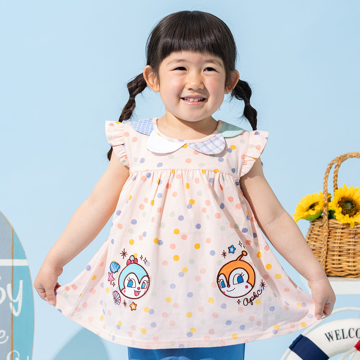 裾にドキンちゃんとコキンちゃんのお顔アップリケが施されています。