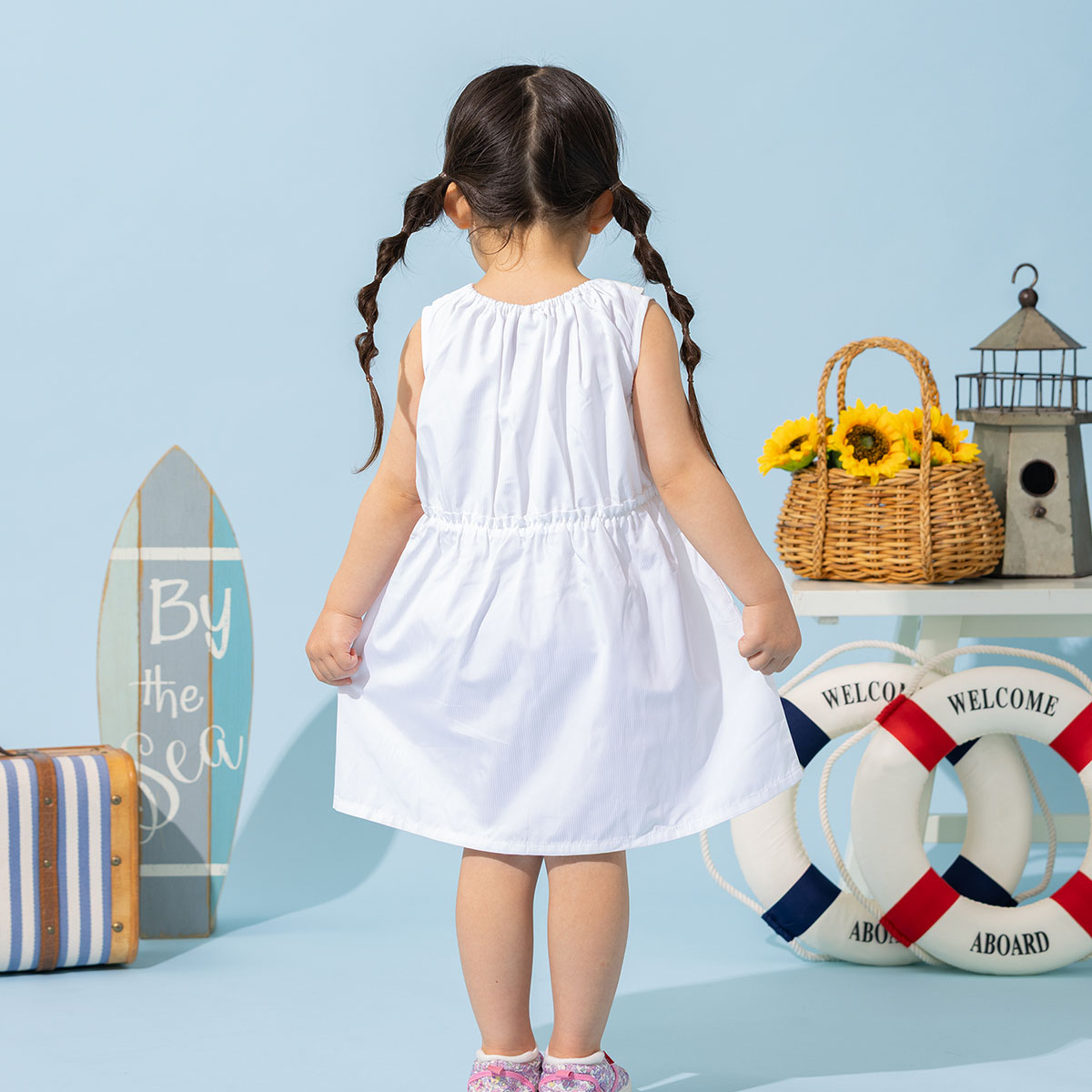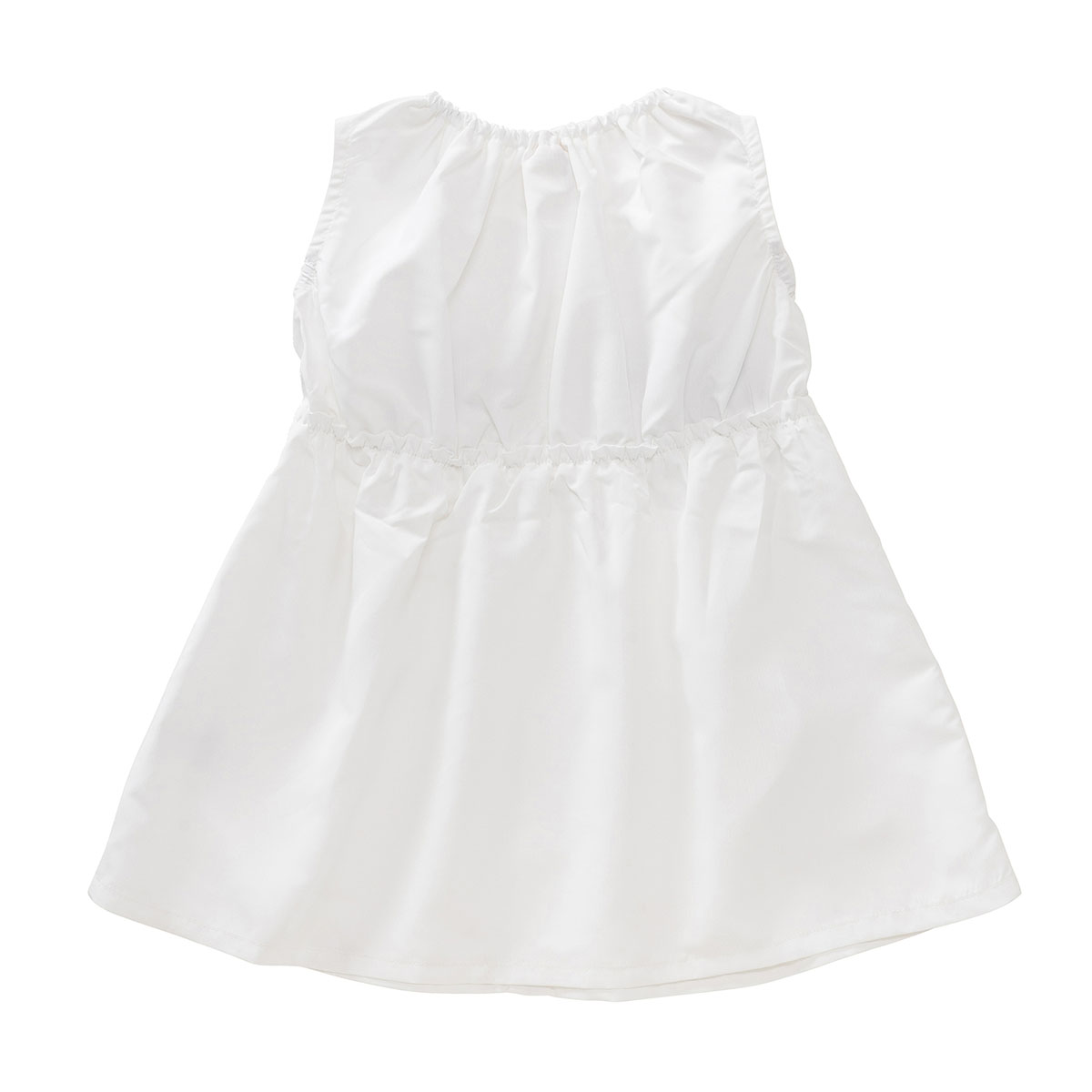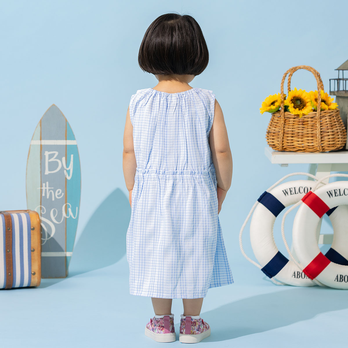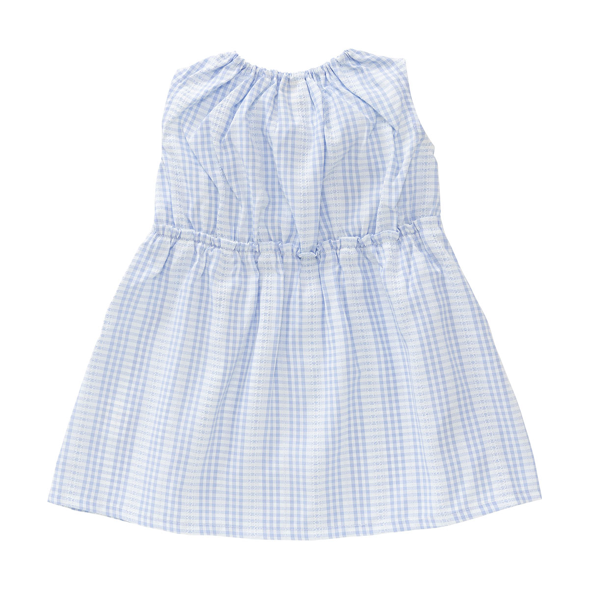 オフ白配色は白ストライプ生地、サックスブルー配色にはチェック生地を使用した夏らしく爽やかで可愛い1枚。