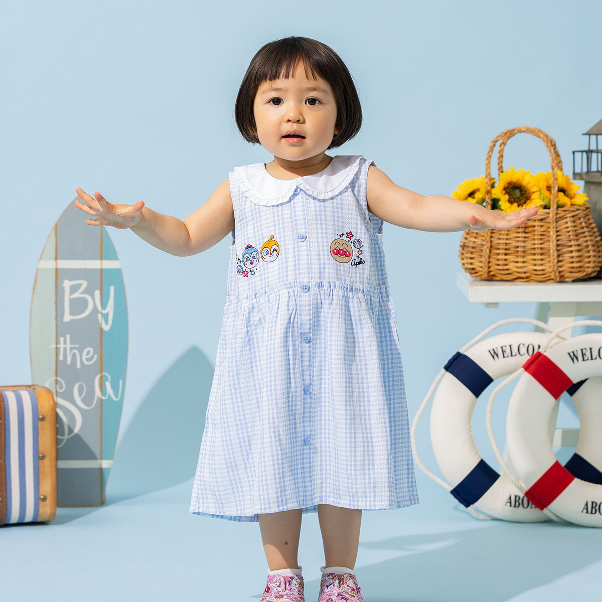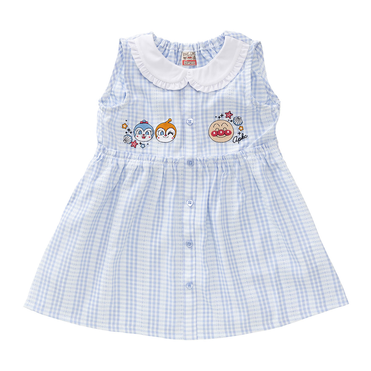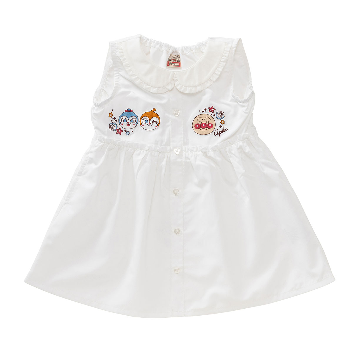 胸元にアンパンマン・ドキンちゃん・コキンちゃんのお顔が刺繍されています。