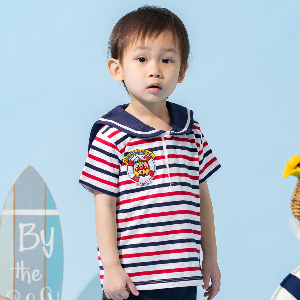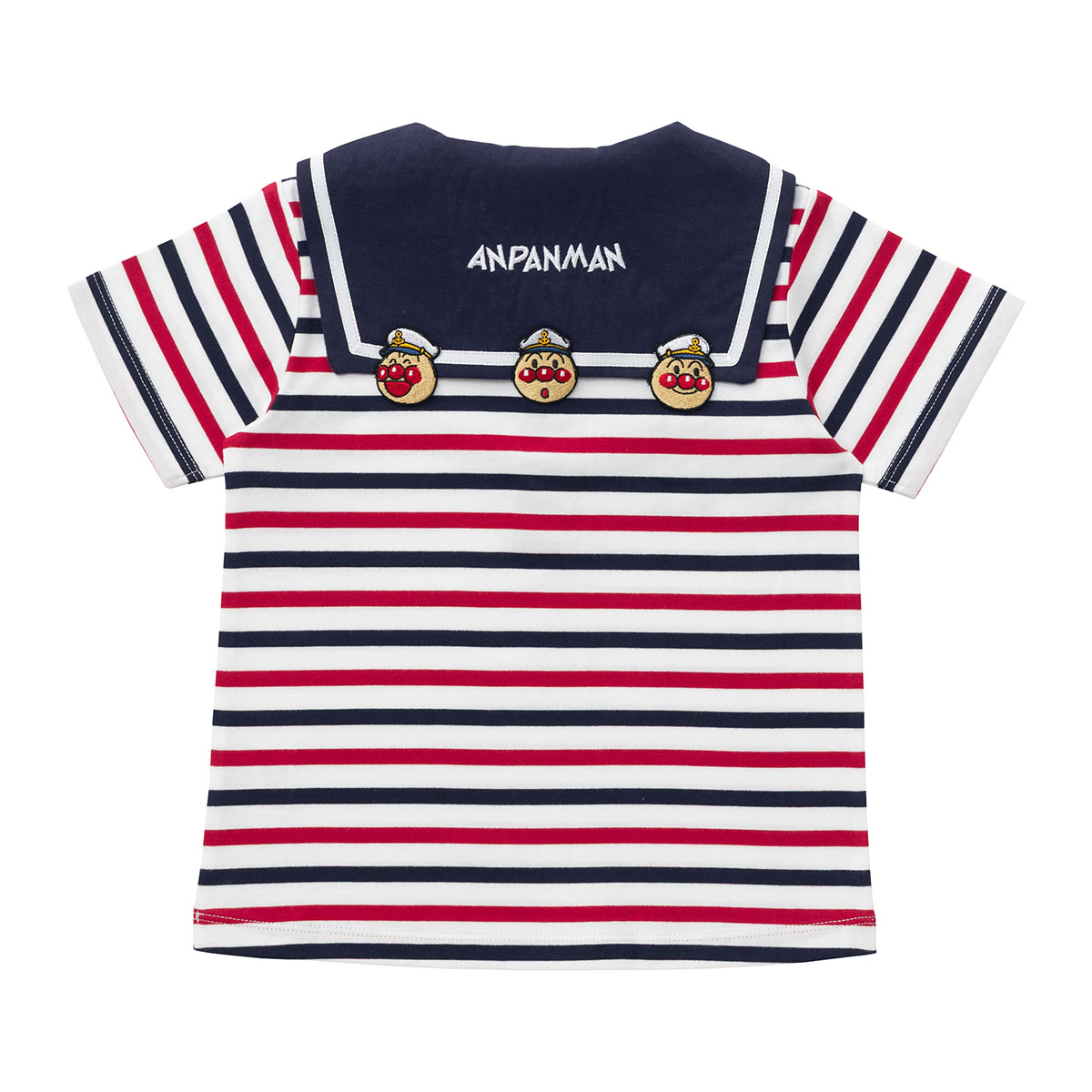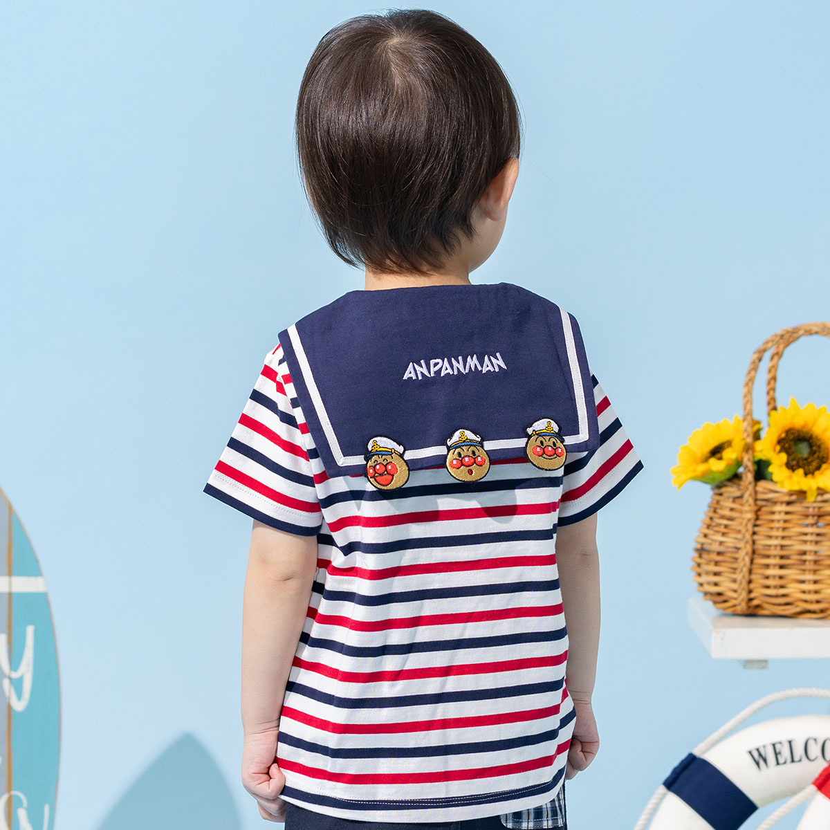 バックのセーラー襟には様々な表情のアンパンマンのお顔の刺繍アップリケが3つ付いており、後ろ姿まで抜かりなく可愛い1枚です。