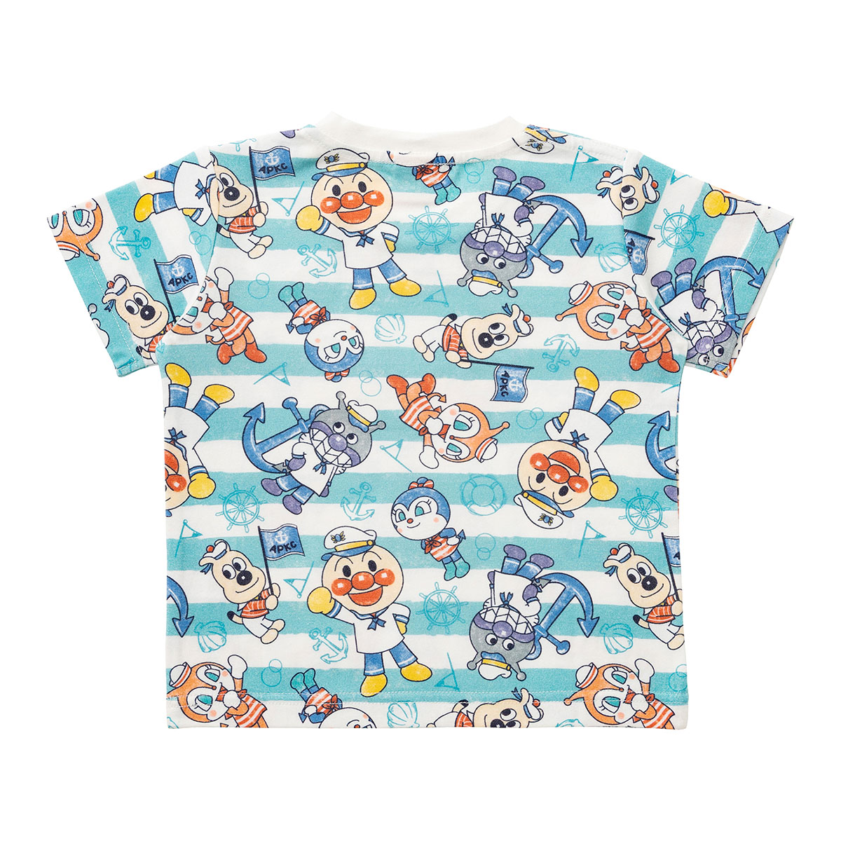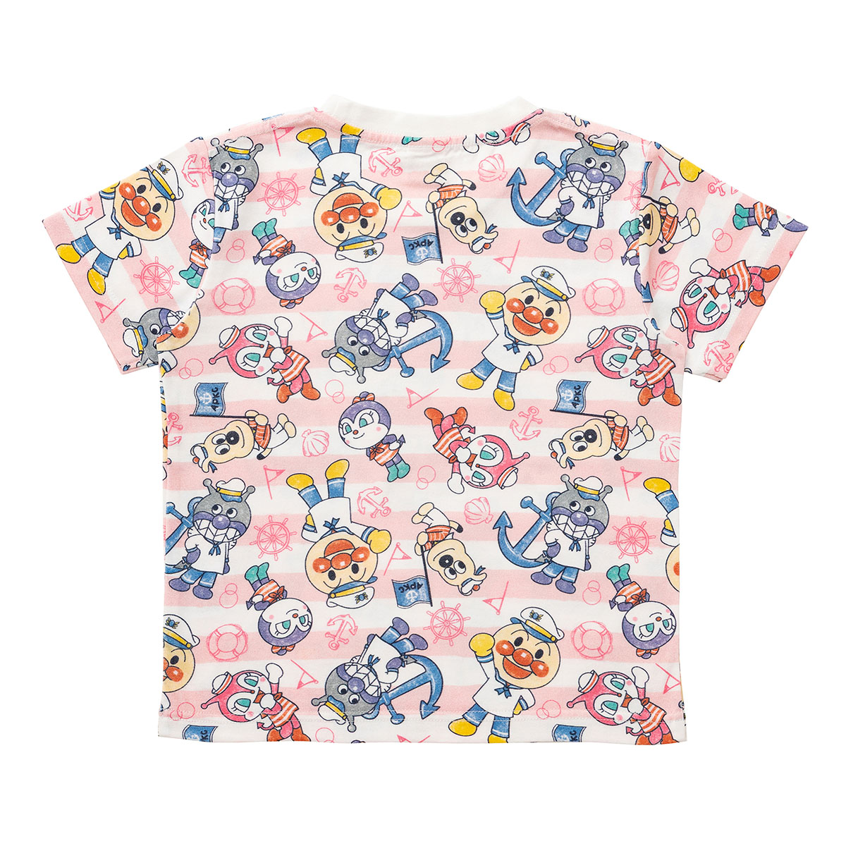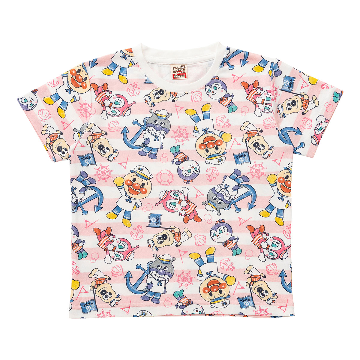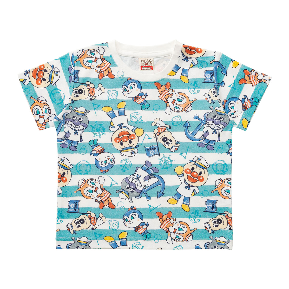 マリンスタイルのアンパンマンたちがかわいいボーダー柄の総柄プリント半袖Tシャツ。