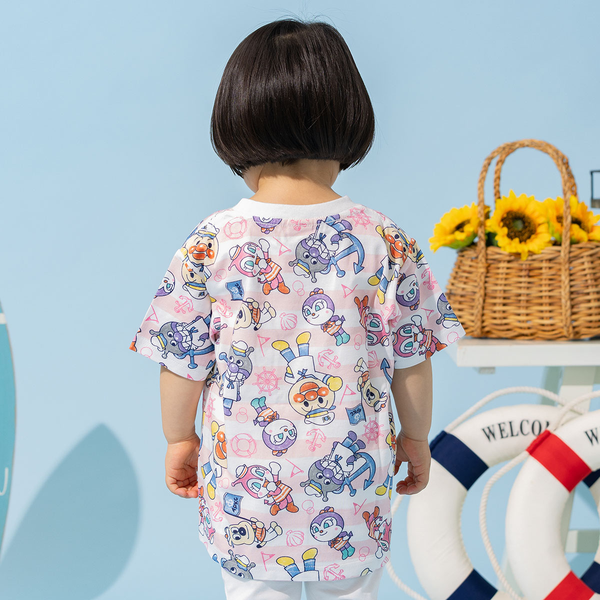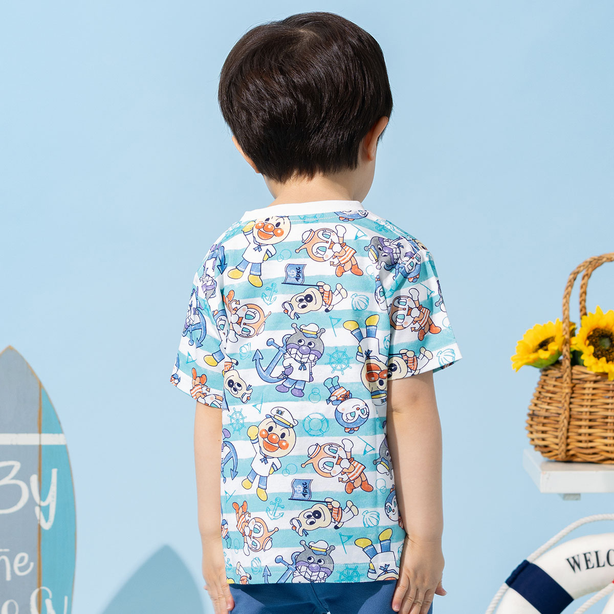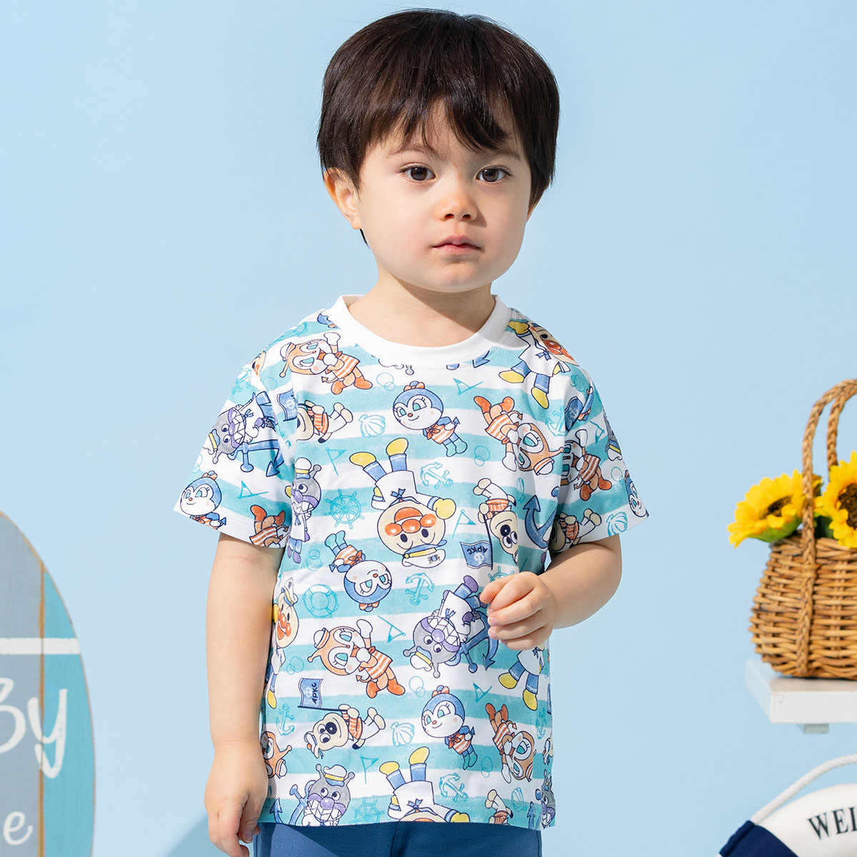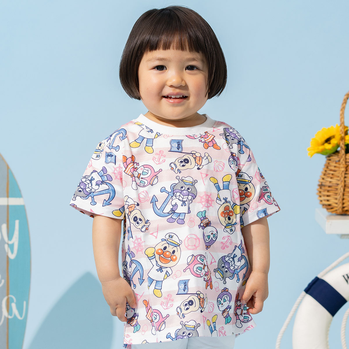 マリンスタイルのアンパンマンたちがかわいいボーダー柄の総柄プリント半袖Tシャツ。