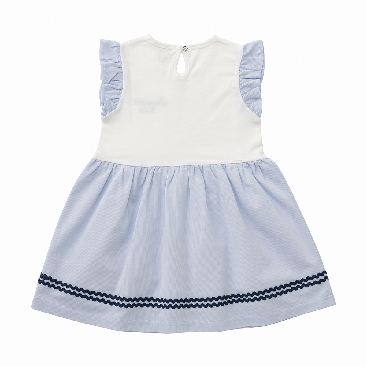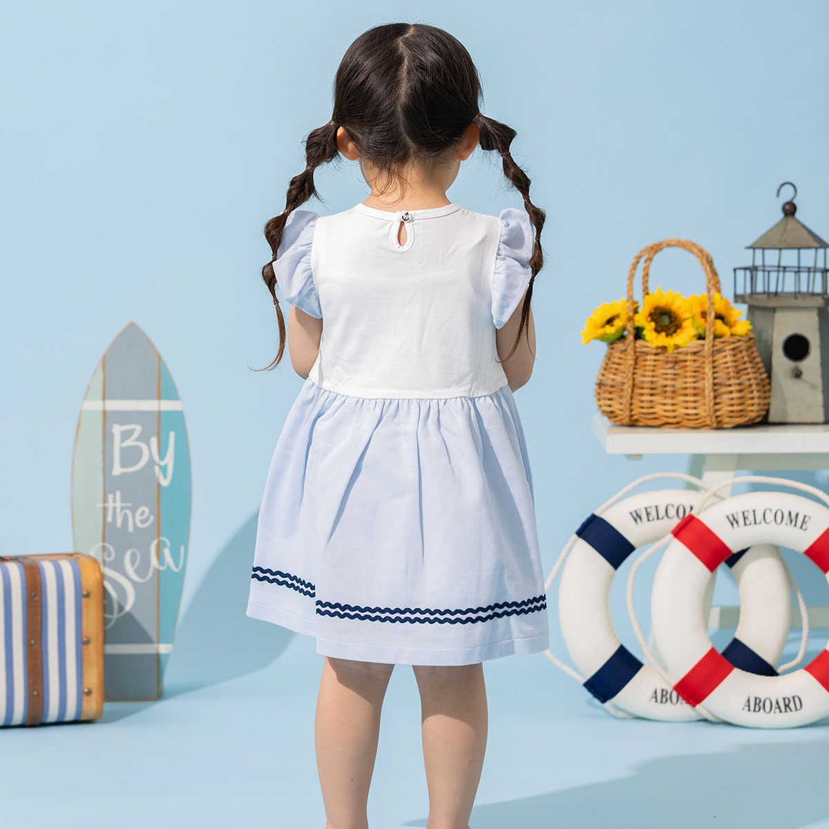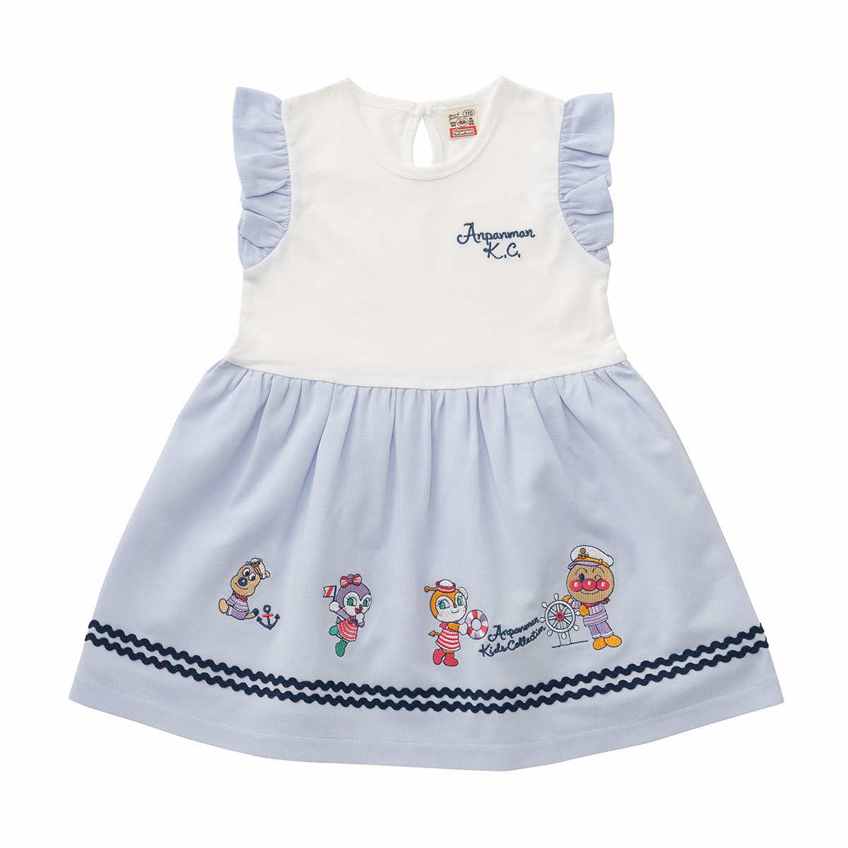 スカート裾に刺繍をあしらったマリンテイストの切替ワンピース。