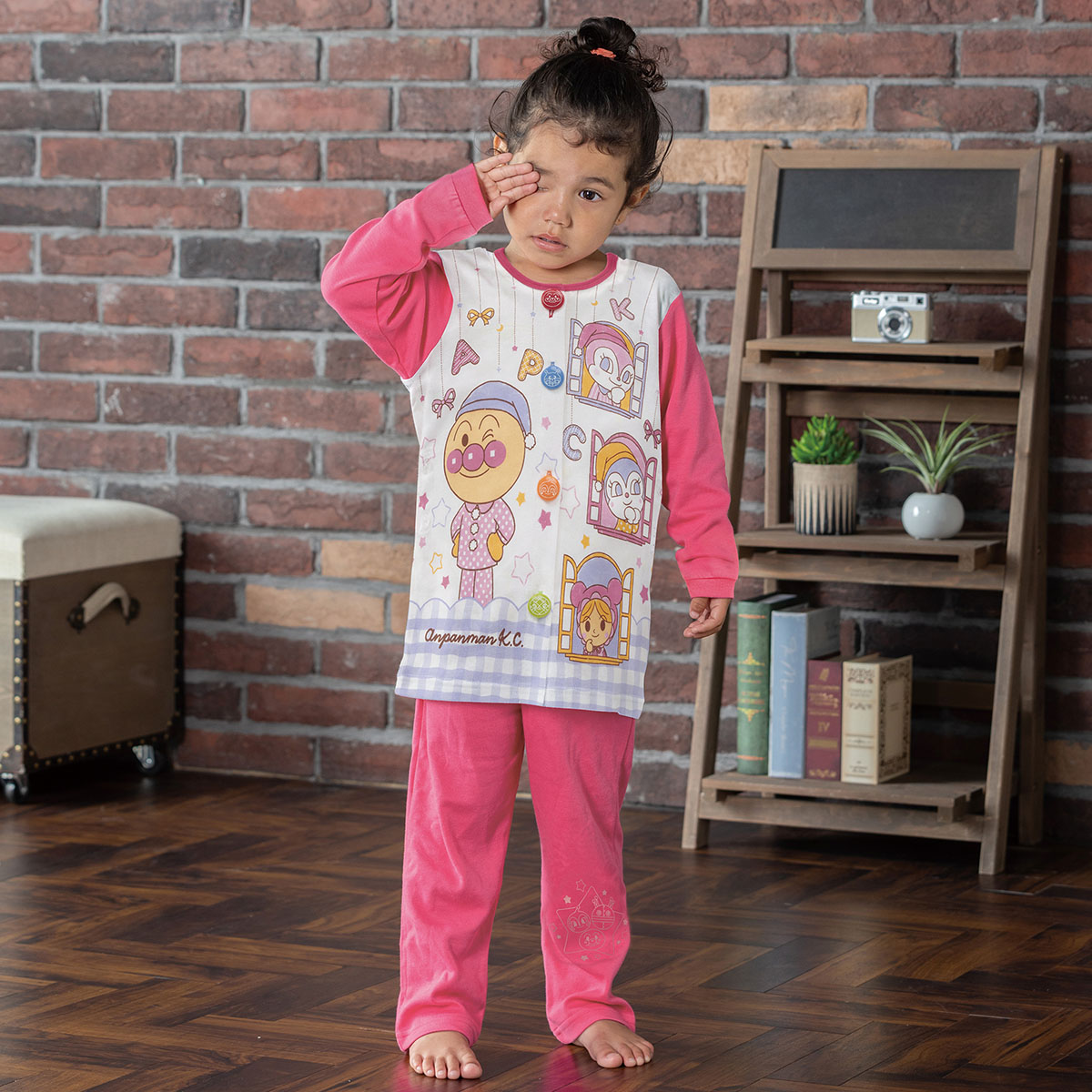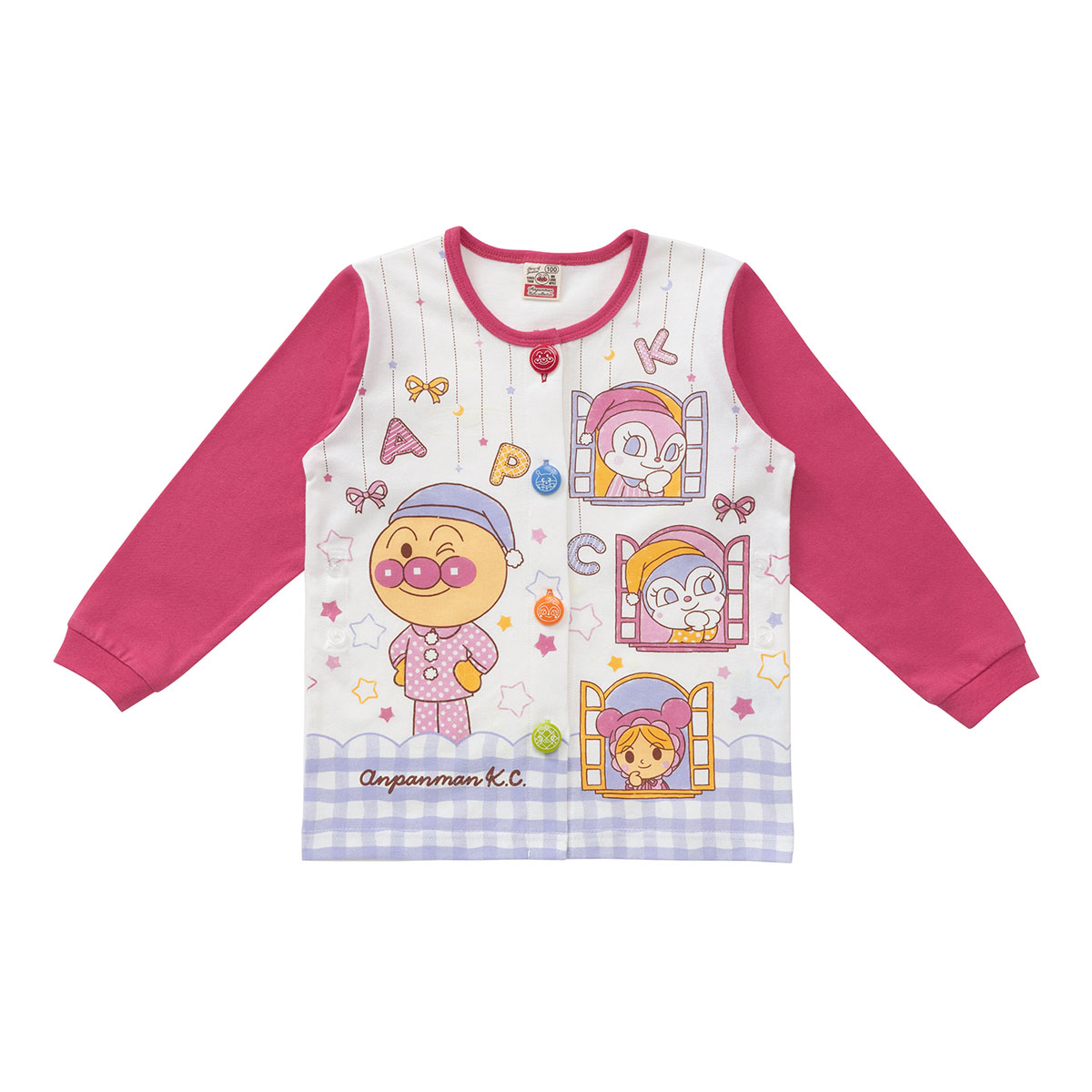 パジャマ姿のアンパンマンと窓からひょこっと顔を出しているなかまたちがかわいらしいデザインです。