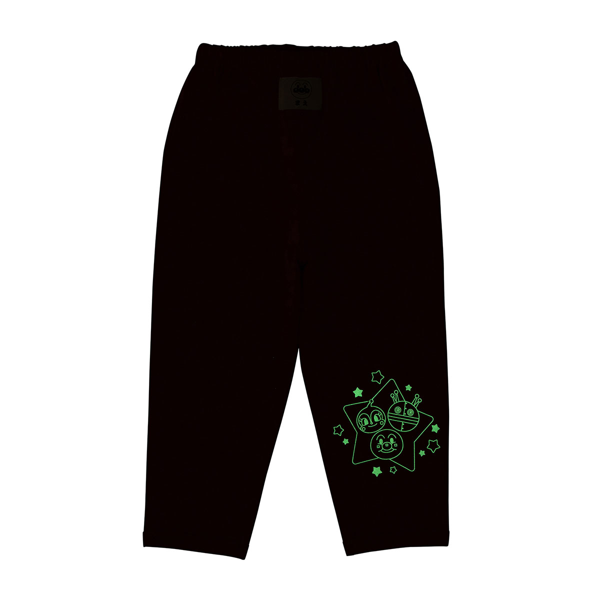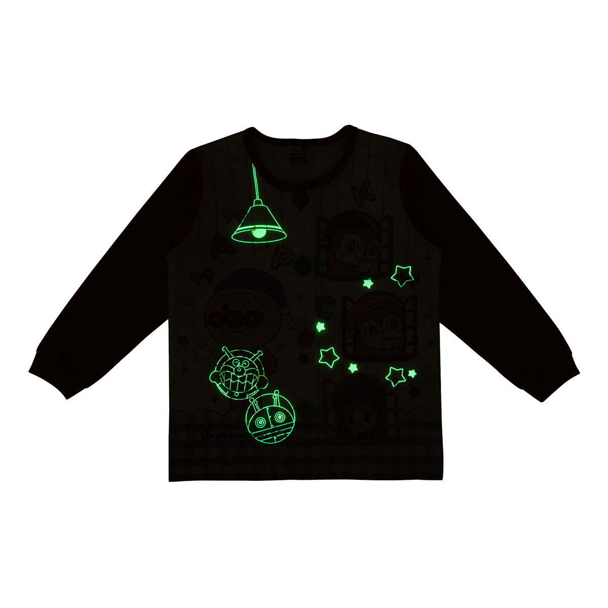 暗いところでは、トップスはだだんだんとばいきんまん、ボトムはアンパンマン、だだんだん、ドキンちゃんが光ります。