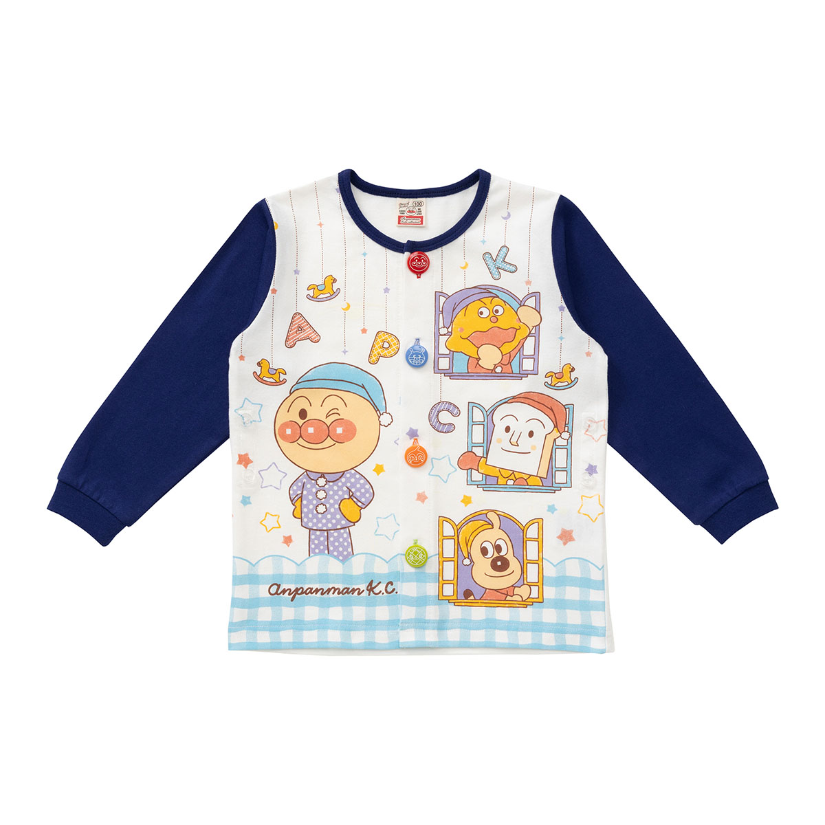 パジャマ姿のアンパンマンと窓からひょこっと顔を出しているなかまたちがかわいらしいデザインです。