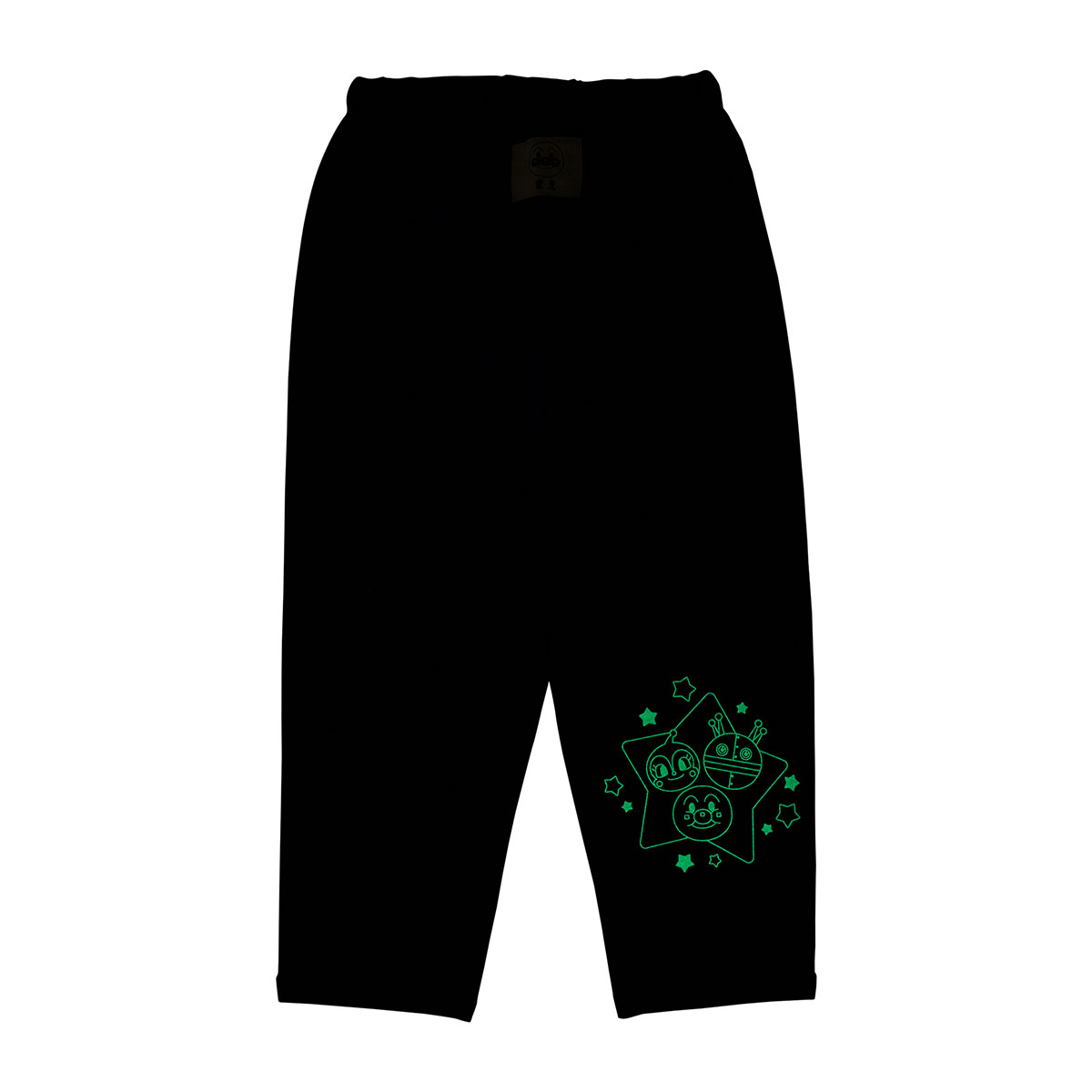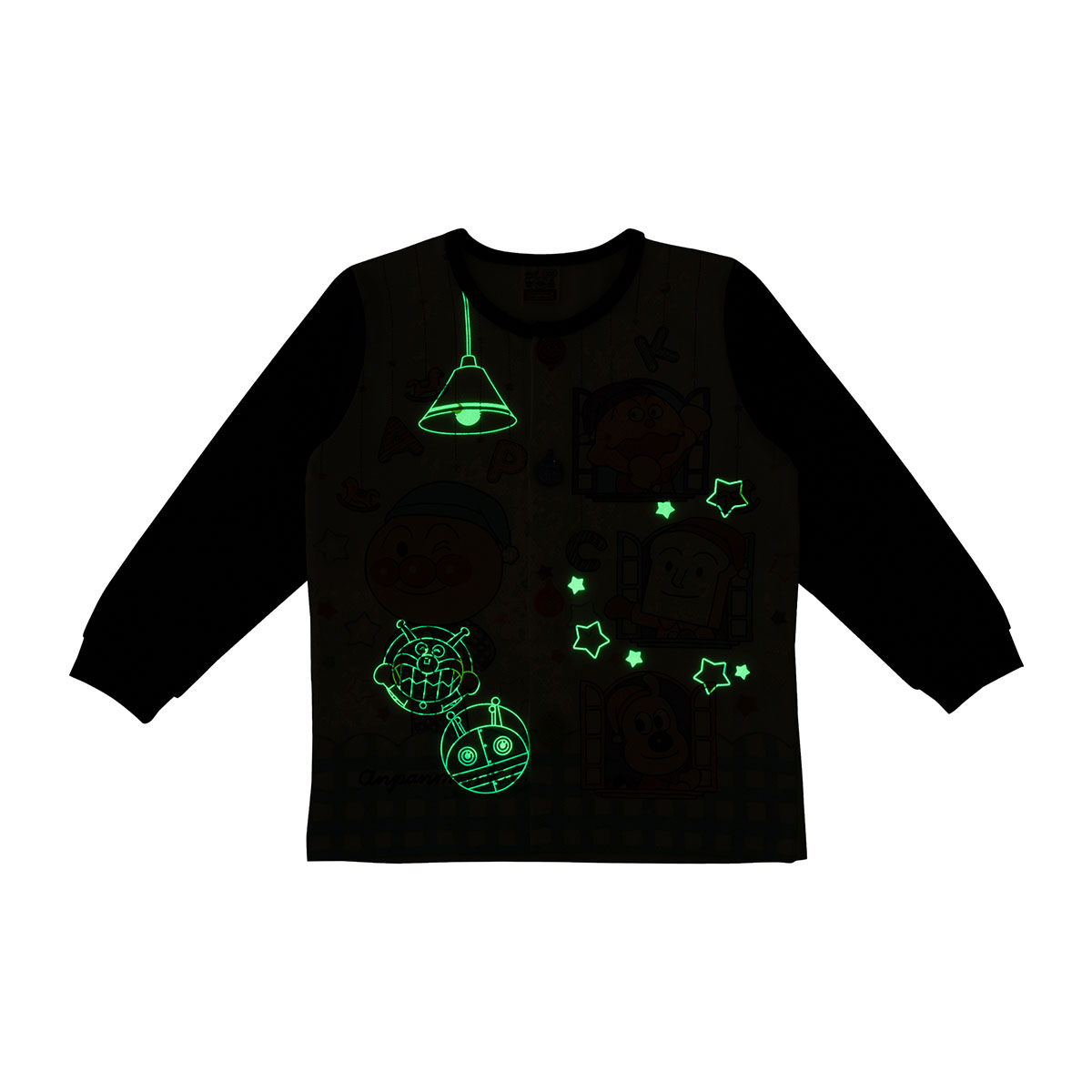 暗いところでは、トップスはだだんだんとばいきんまん、ボトムはアンパンマン、だだんだん、ドキンちゃんが光ります。