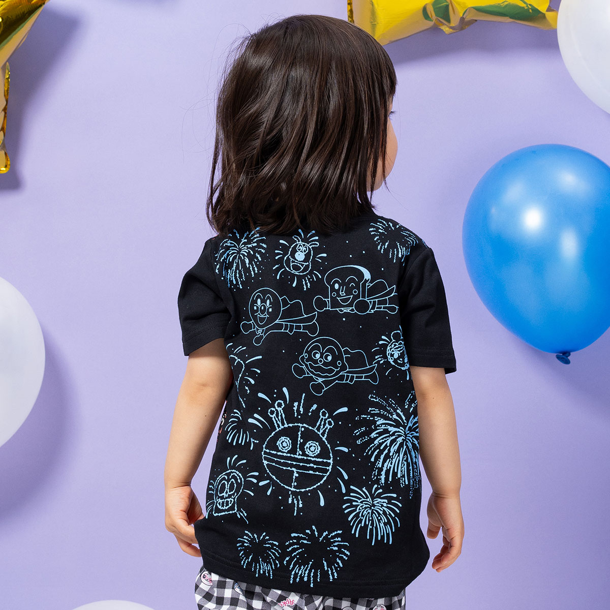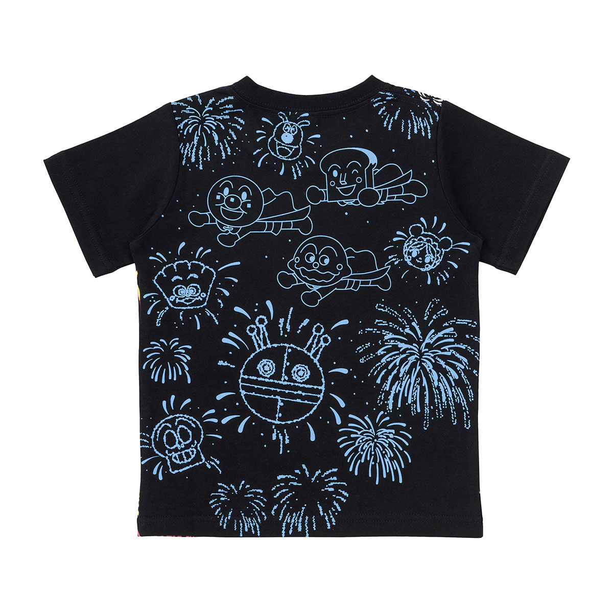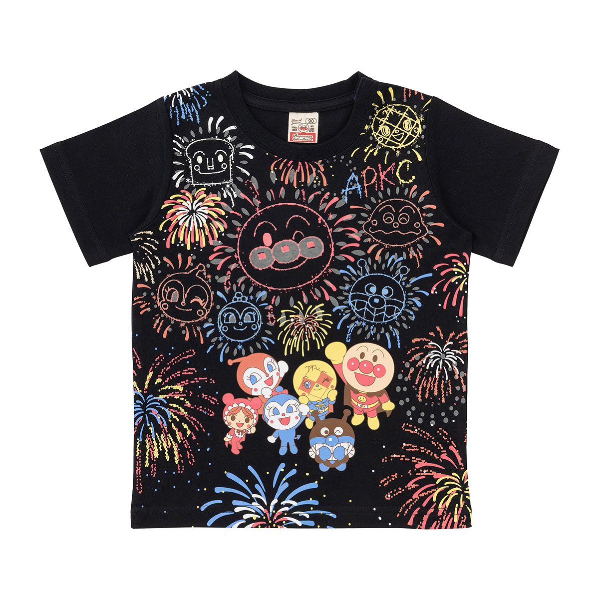 アンパンマンとたくさんのなかまたちが花火を見上げているデザインの半袖Tシャツ。