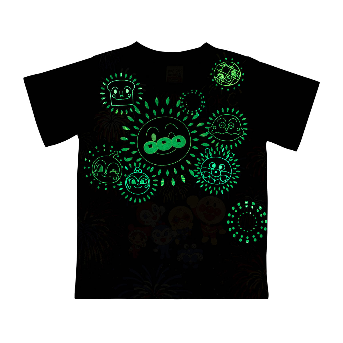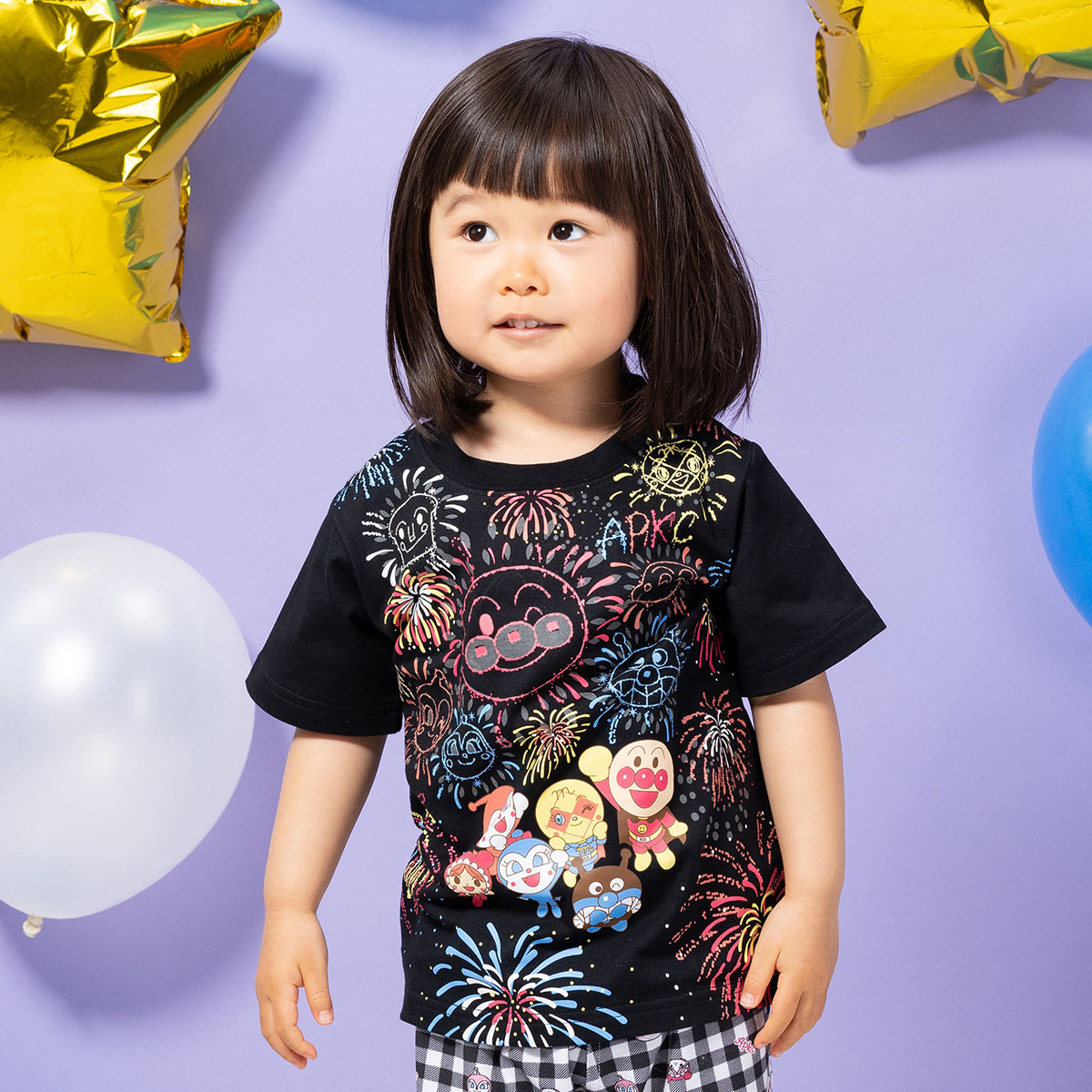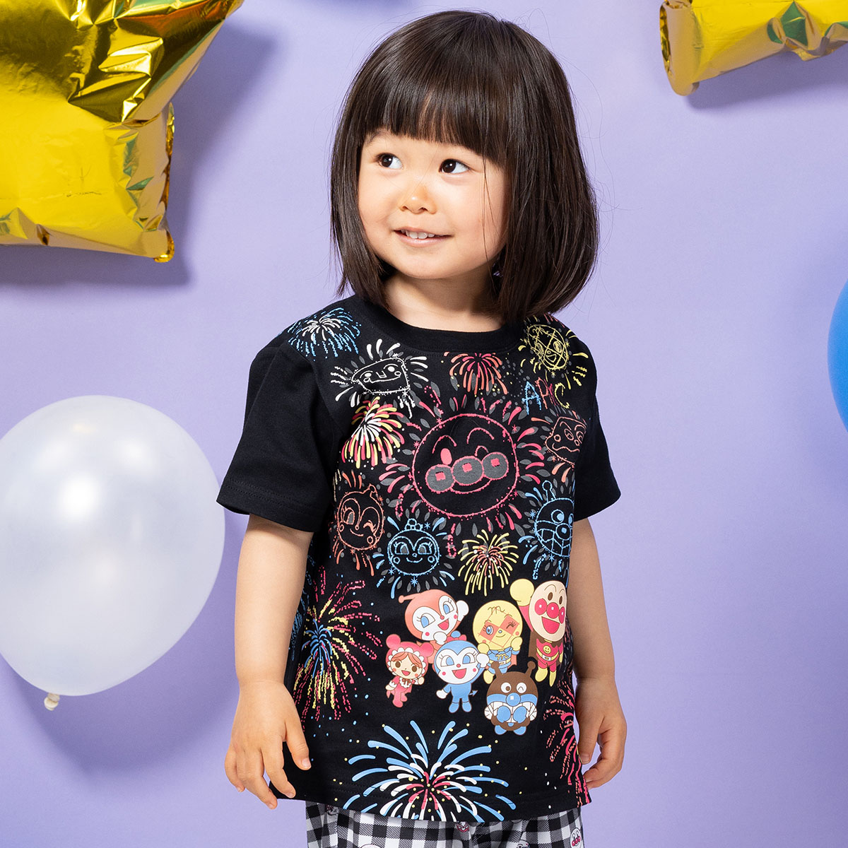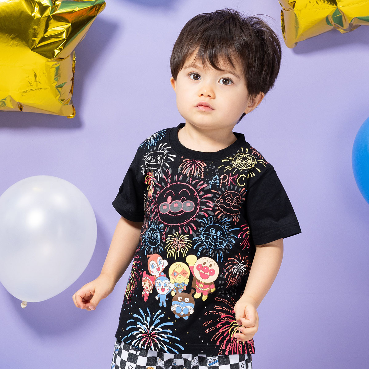 アンパンマンとたくさんのなかまたちが花火を見上げているデザインの半袖Tシャツ。