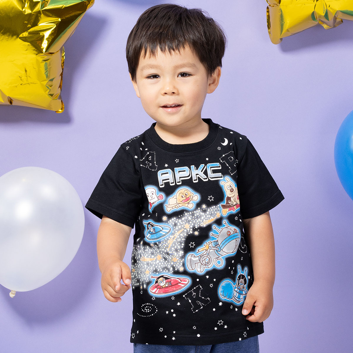アンパンマンたちが夜空を飛んでいるようなデザインがかっこいい半袖Tシャツ。