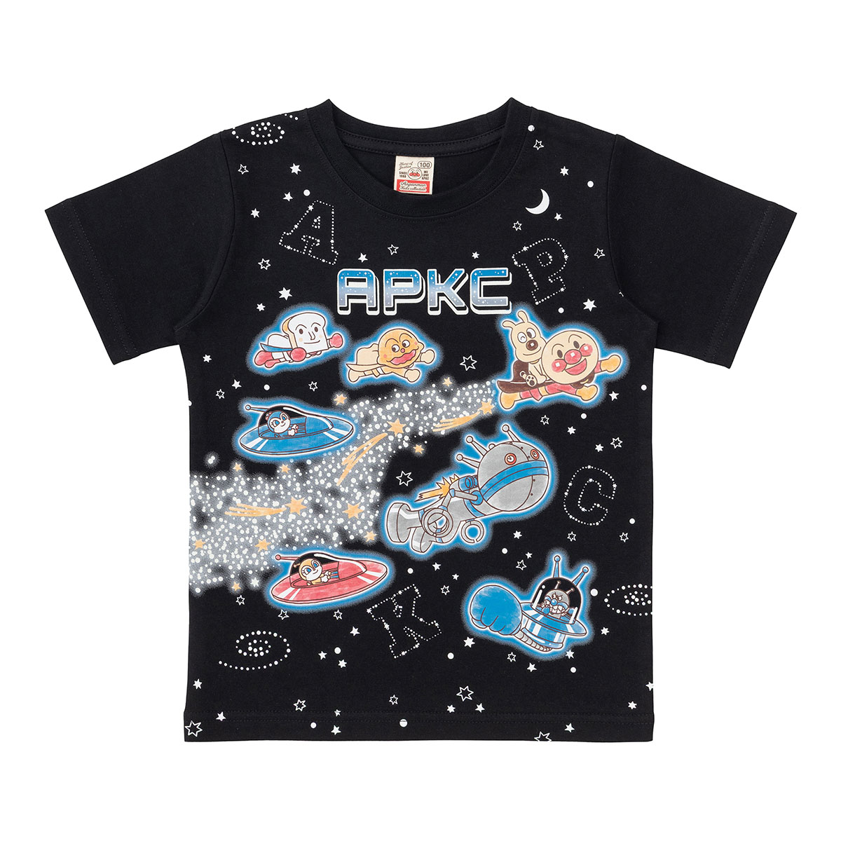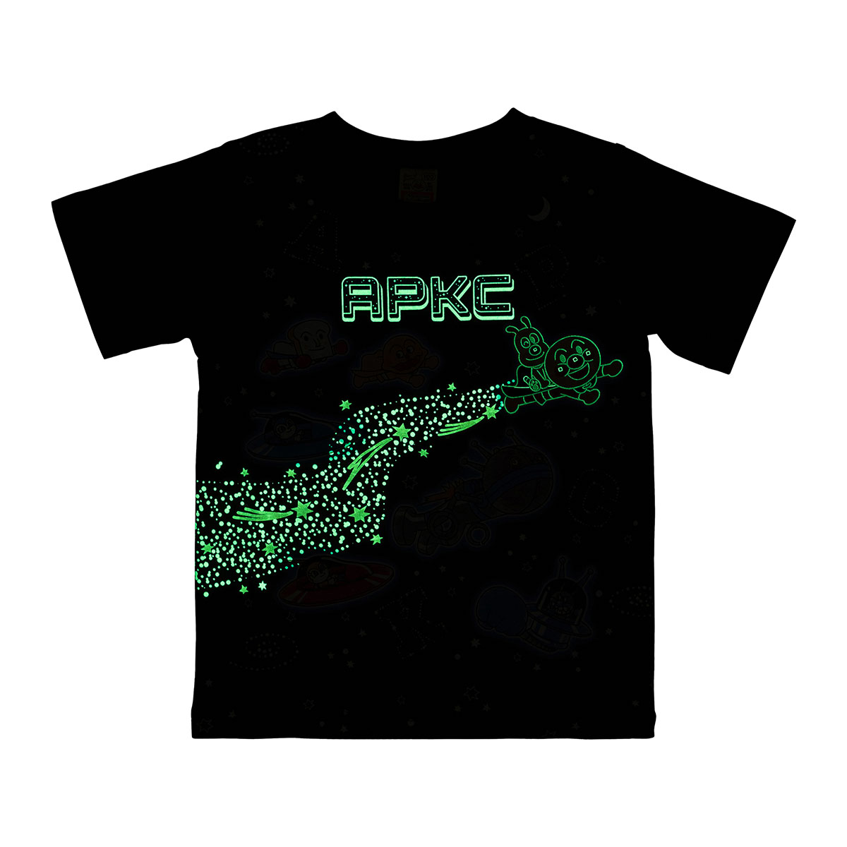 フロントプリントは一部蓄光加工が施されており、暗いところではアンパンマンとめいけんチーズと流れ星が光る楽しい仕様です。
