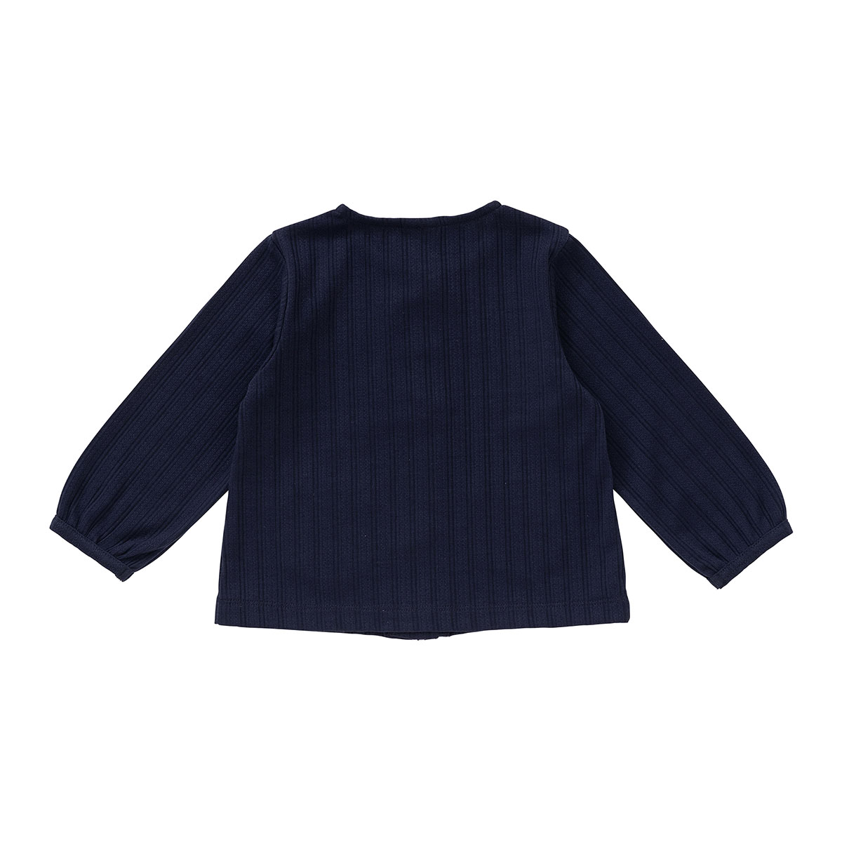 ボタンはお花の刻印入りで、ボタン裏にはドット柄のテープを施しており、細かいところにもこだわった1枚です。