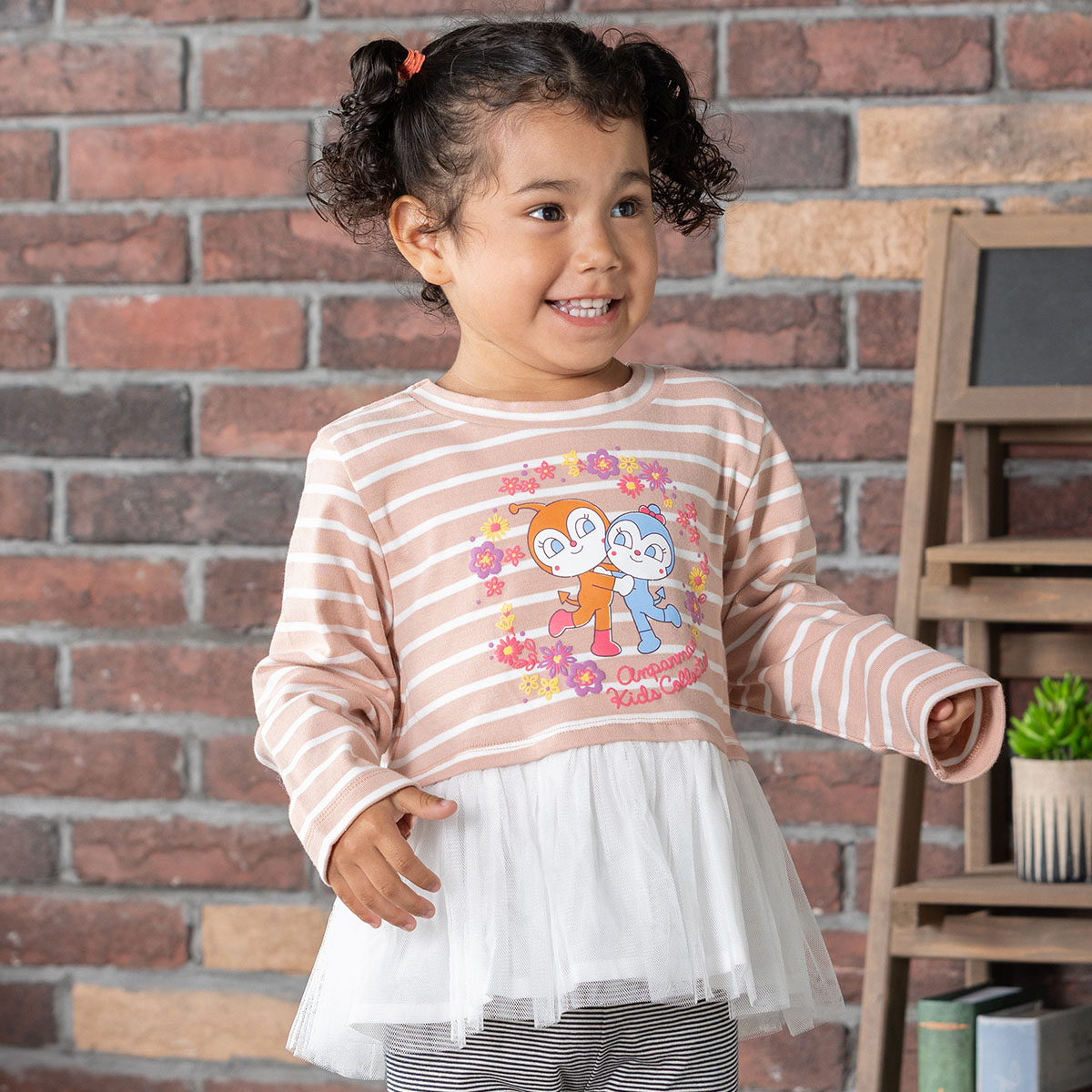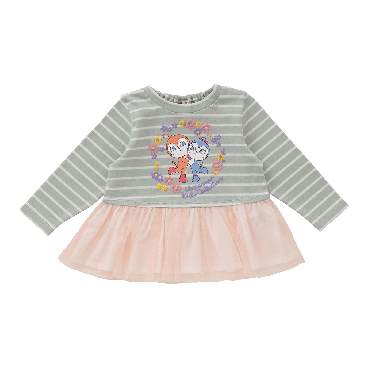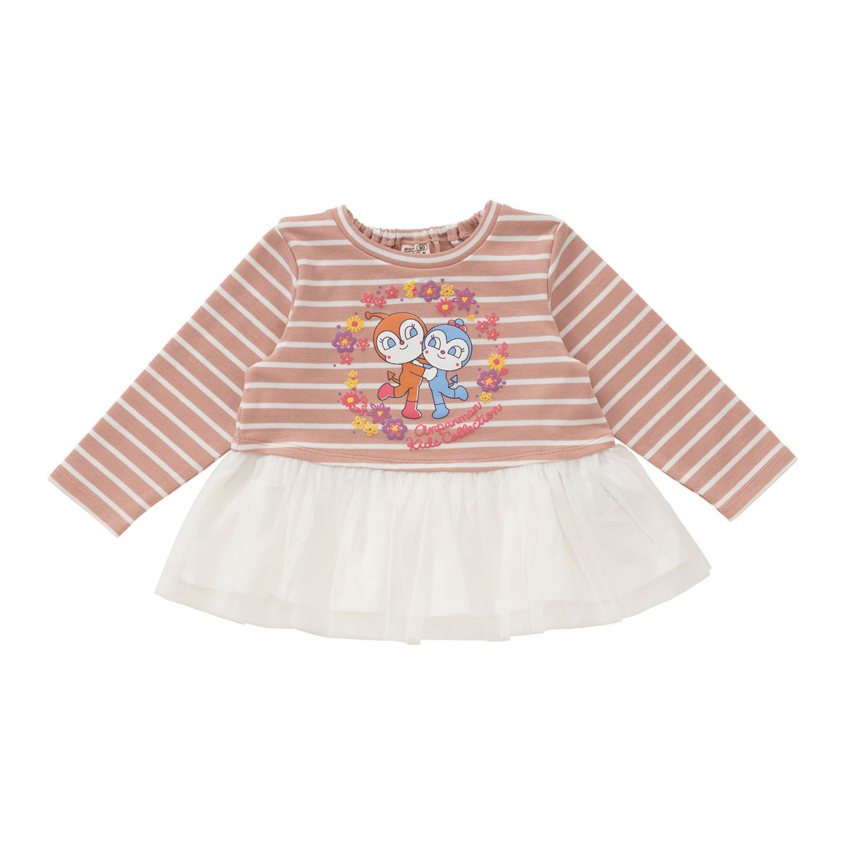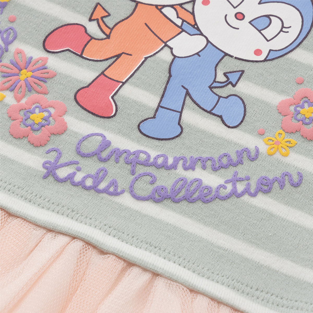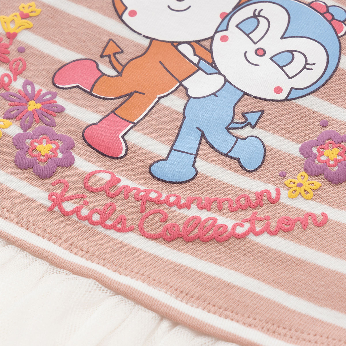 切替上は先染めボーダー生地にドキンちゃんとコキンちゃんがプリントされており、周りのお花は発泡プリントになっています。