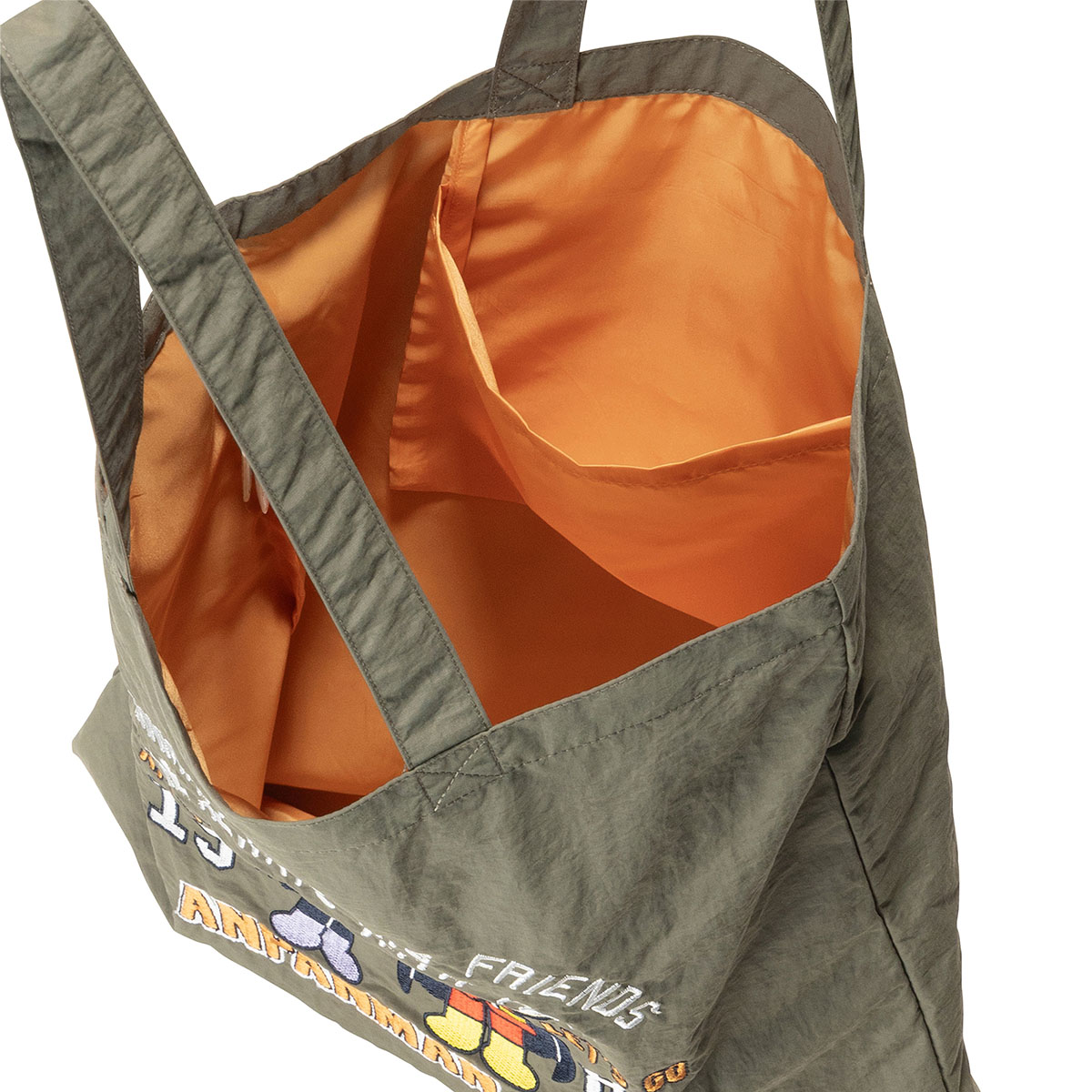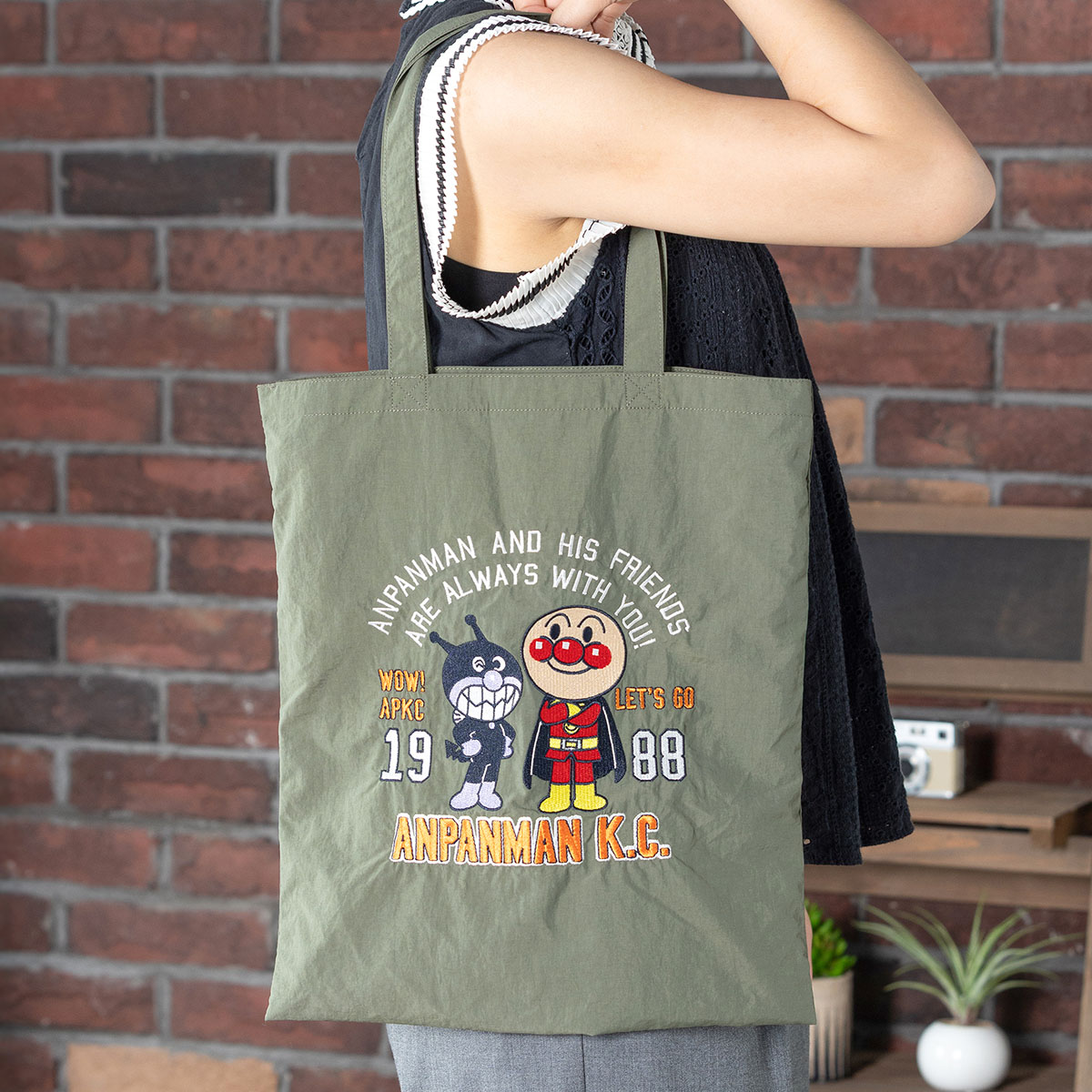 ナイロン素材にアンパンマンとばいきんまんの豪華な刺繍をあしらった遊び心あふれるトートバッグ。