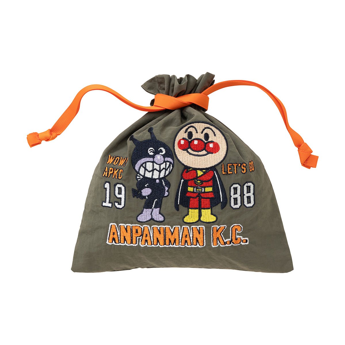 ナイロン素材にアンパンマンとばいきんまんの豪華な刺繍を施した、遊び心あふれる巾着。