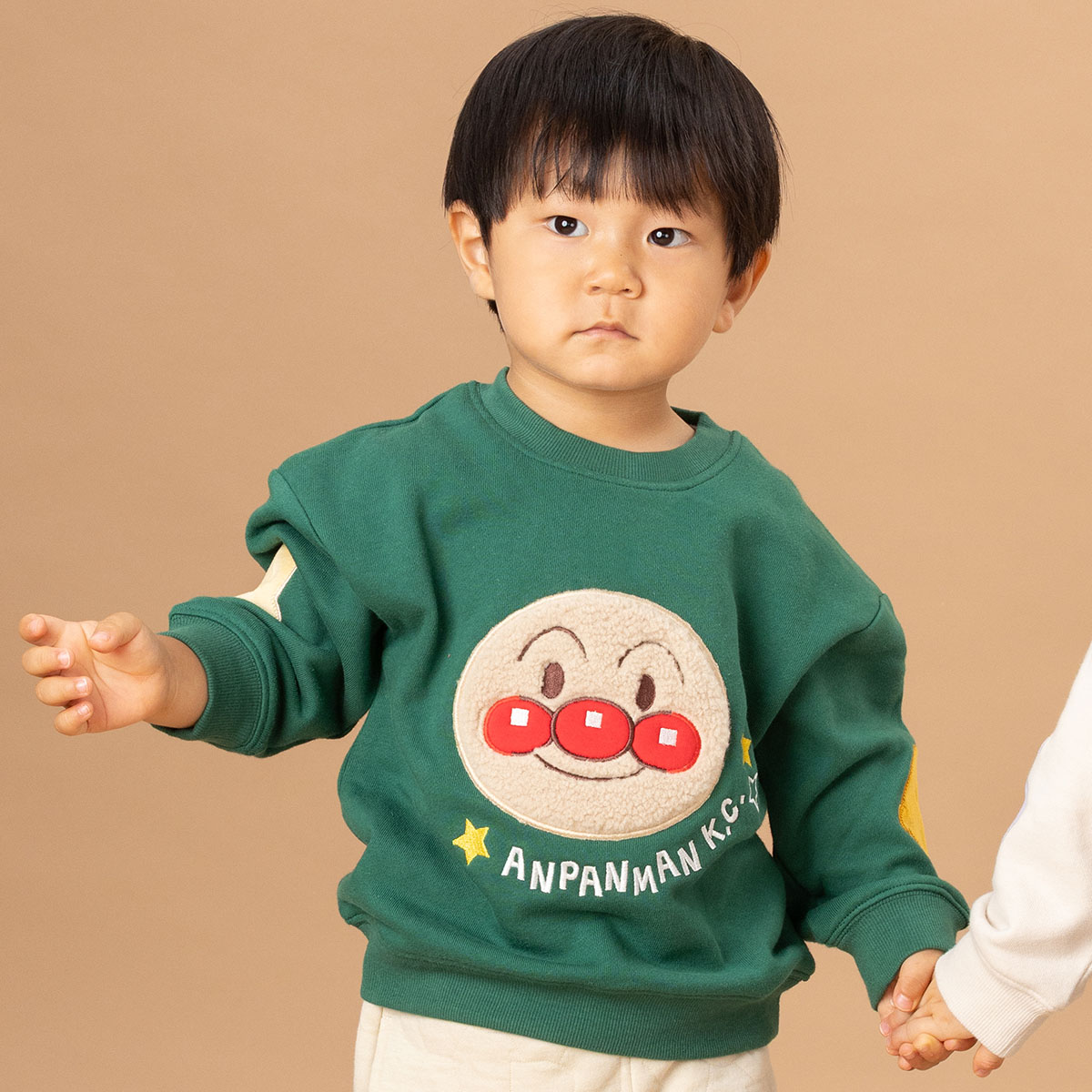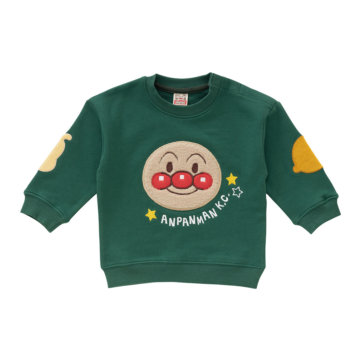 袖にはパッチがついており、グリーンはめいけんチーズとカレーパンマン、ベージュはばいきんまんとドキンちゃんのシルエットデザインです。