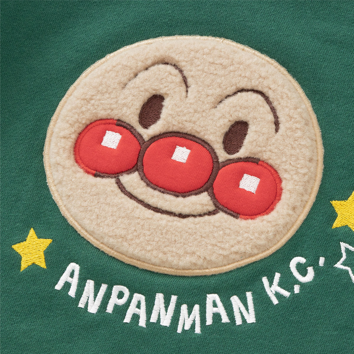 グリーンはアンパンマン、ベージュはだだんだんのお顔がもこもこのボア素材でアップリケ刺繍されています。