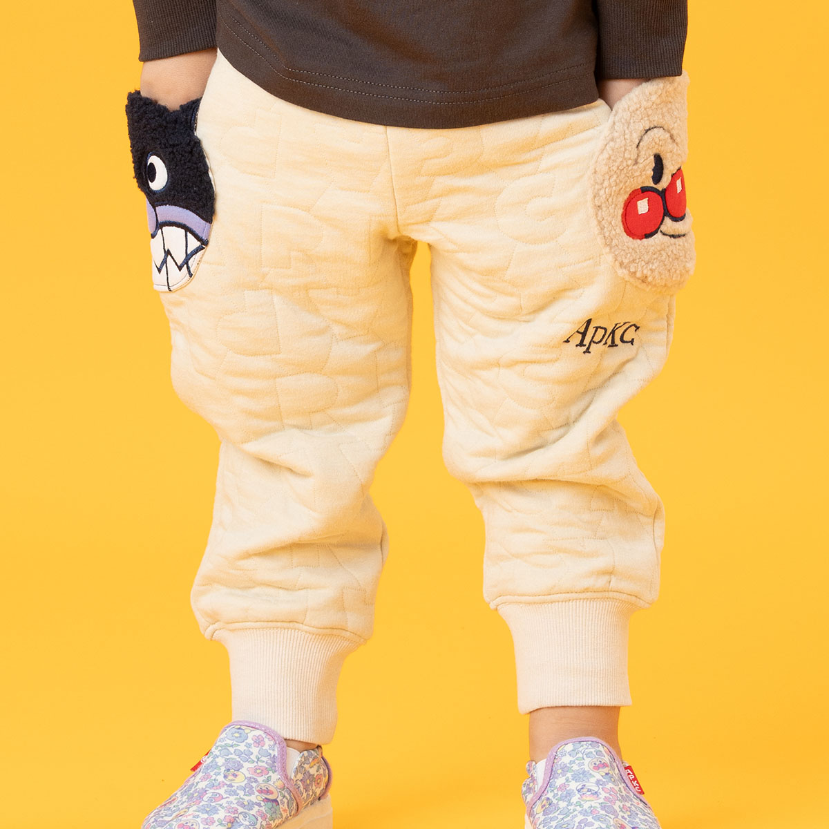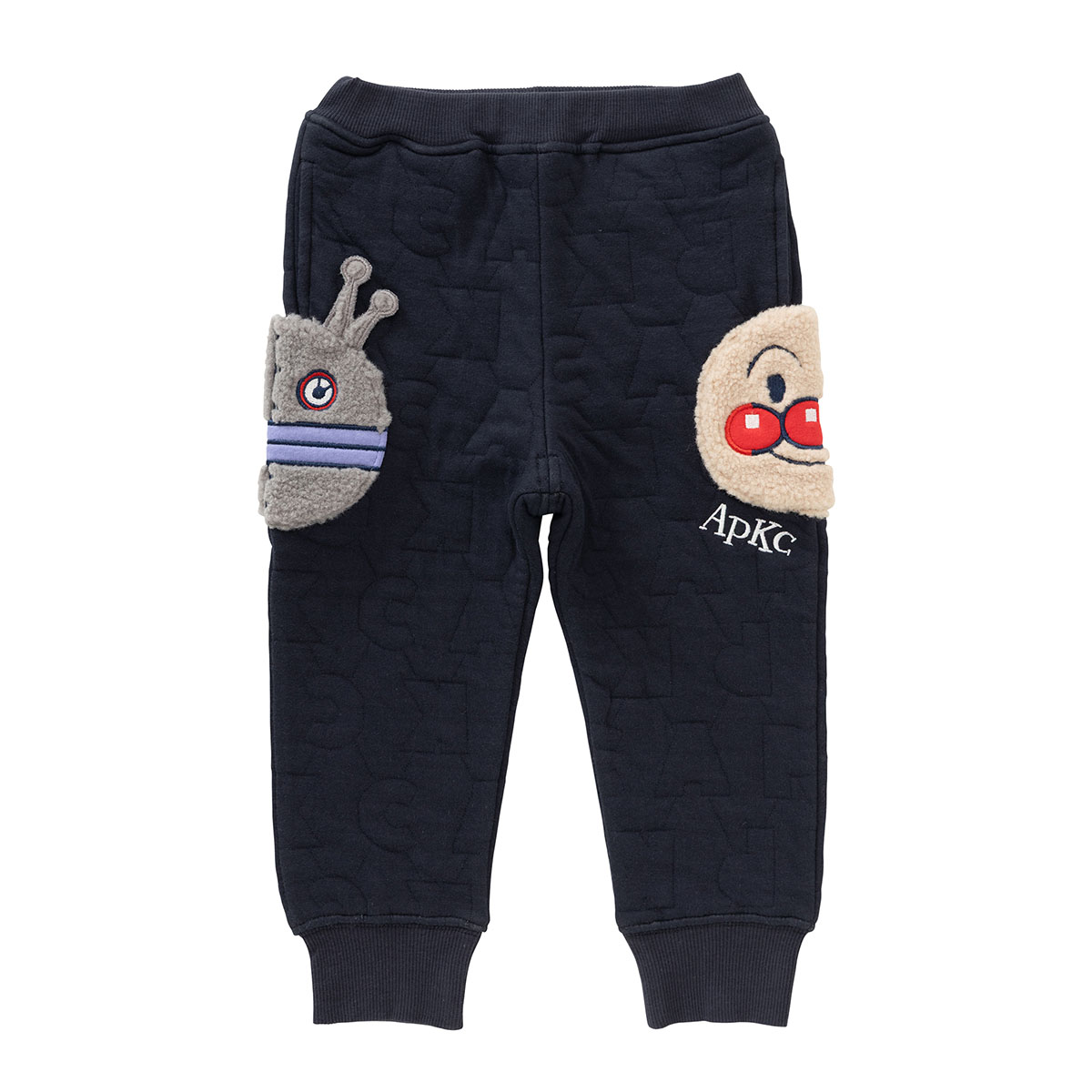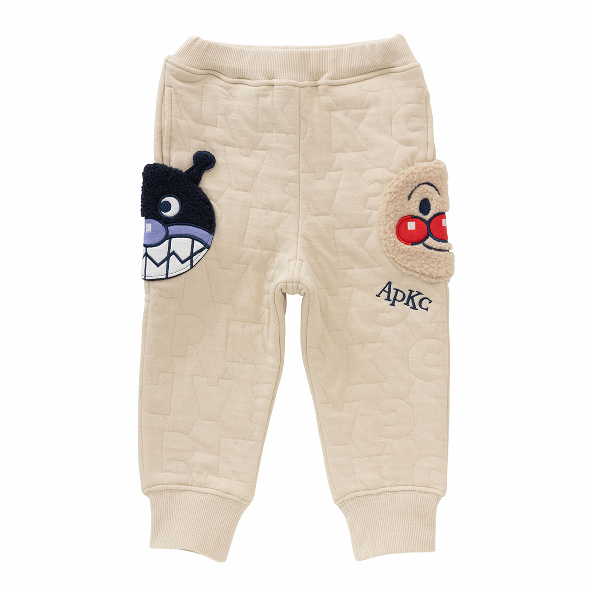 APKCのアルファベットロゴ柄のキルト生地を使用した豪華で凝ったパンツです。