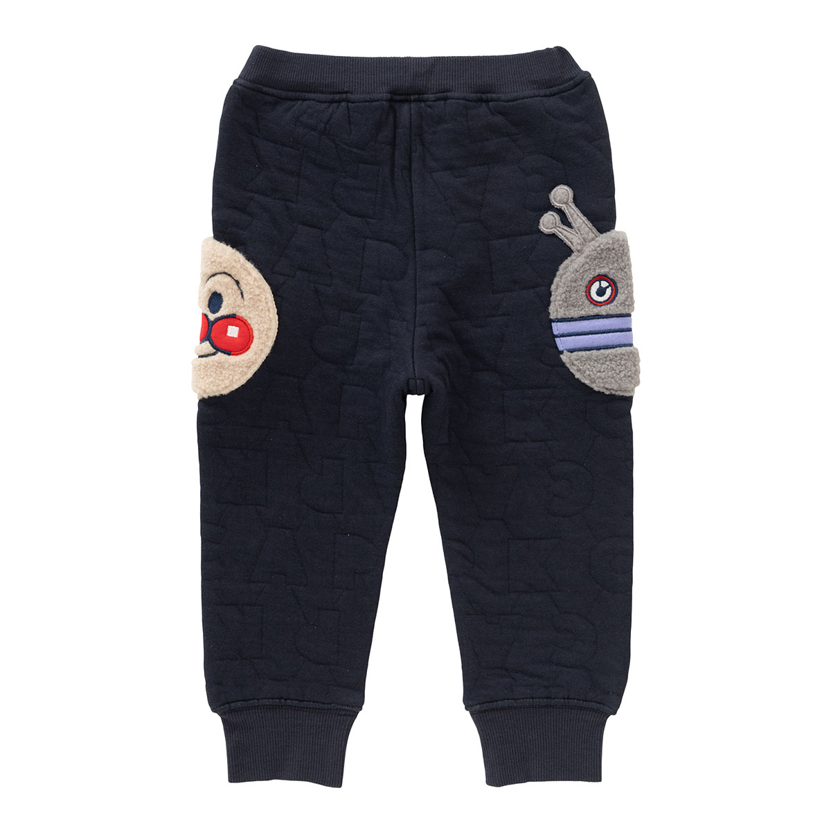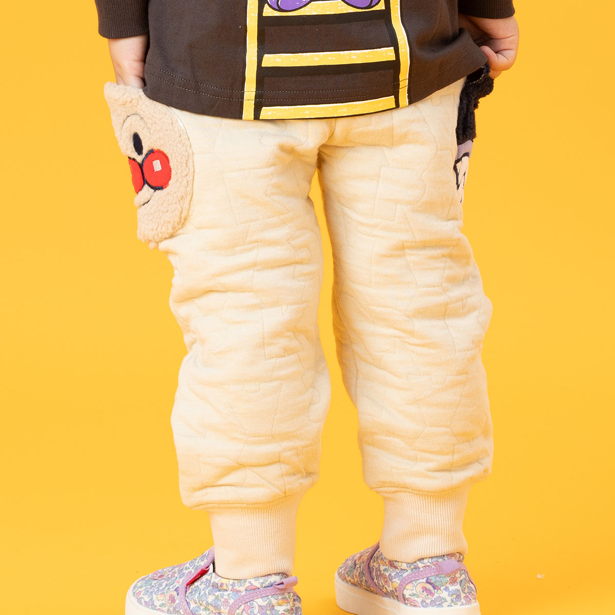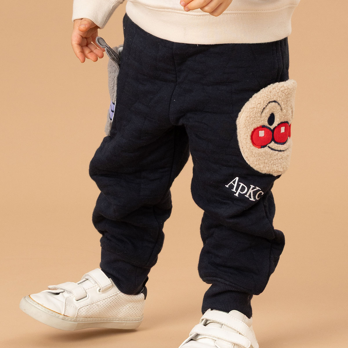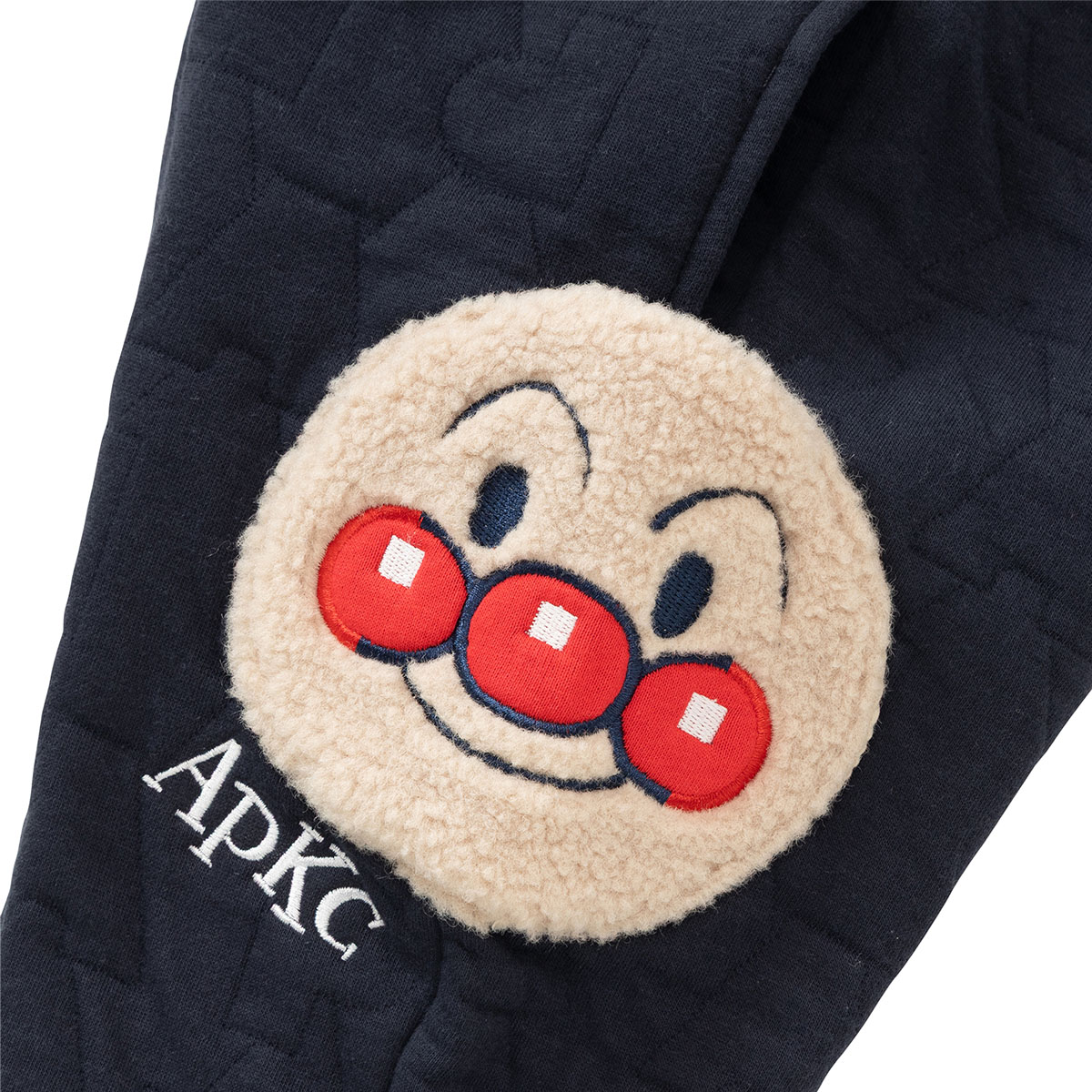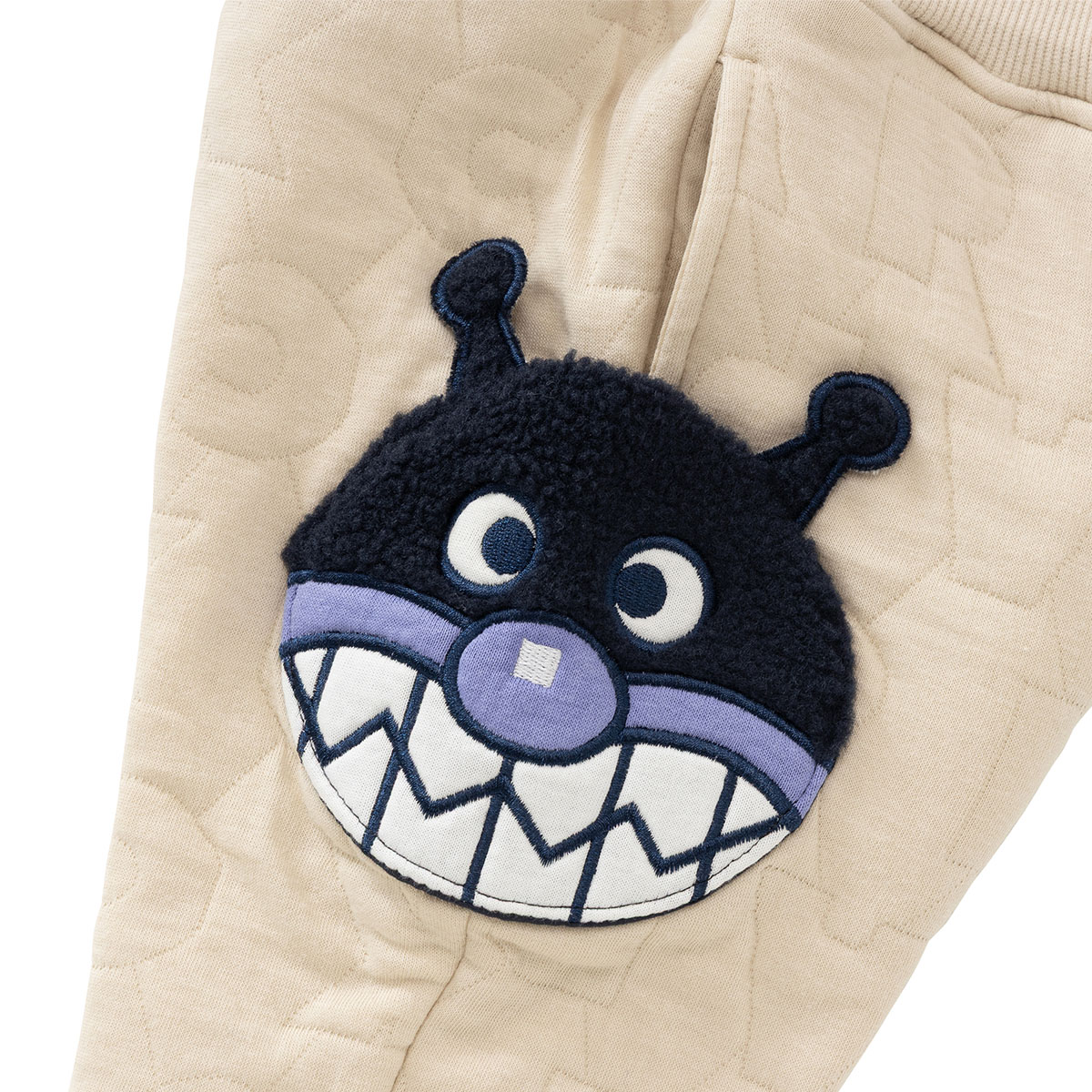 ベージュはアンパンマンとばいきんまん、ネイビーはアンパンマンとだだんだんのお顔がもこもこのボア素材を使用したアップリケポケットになっています。