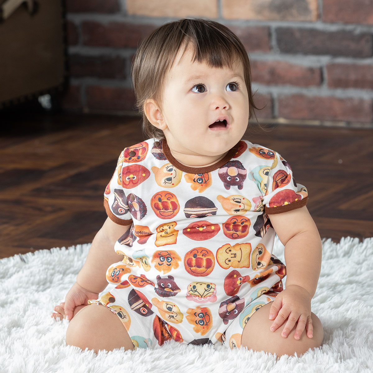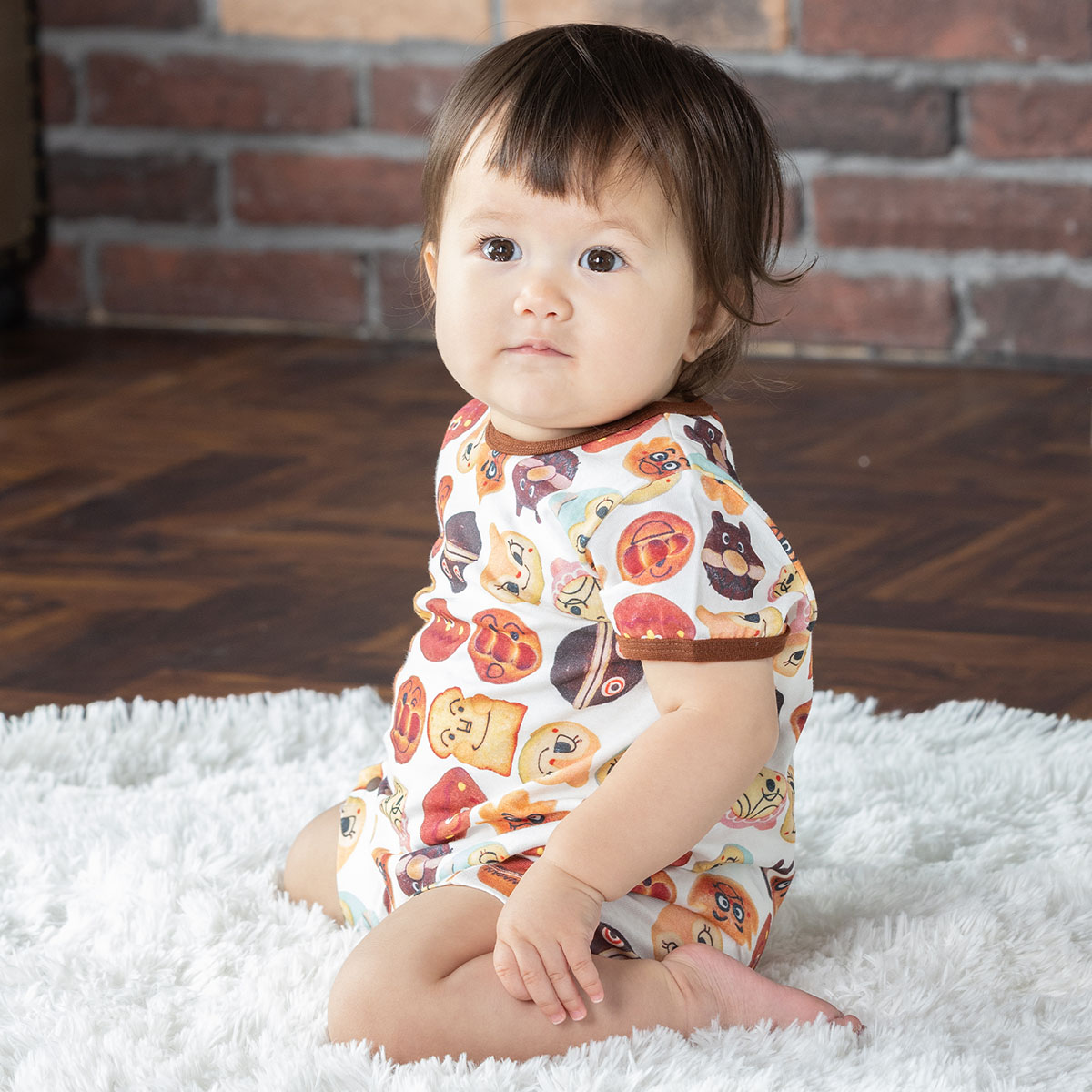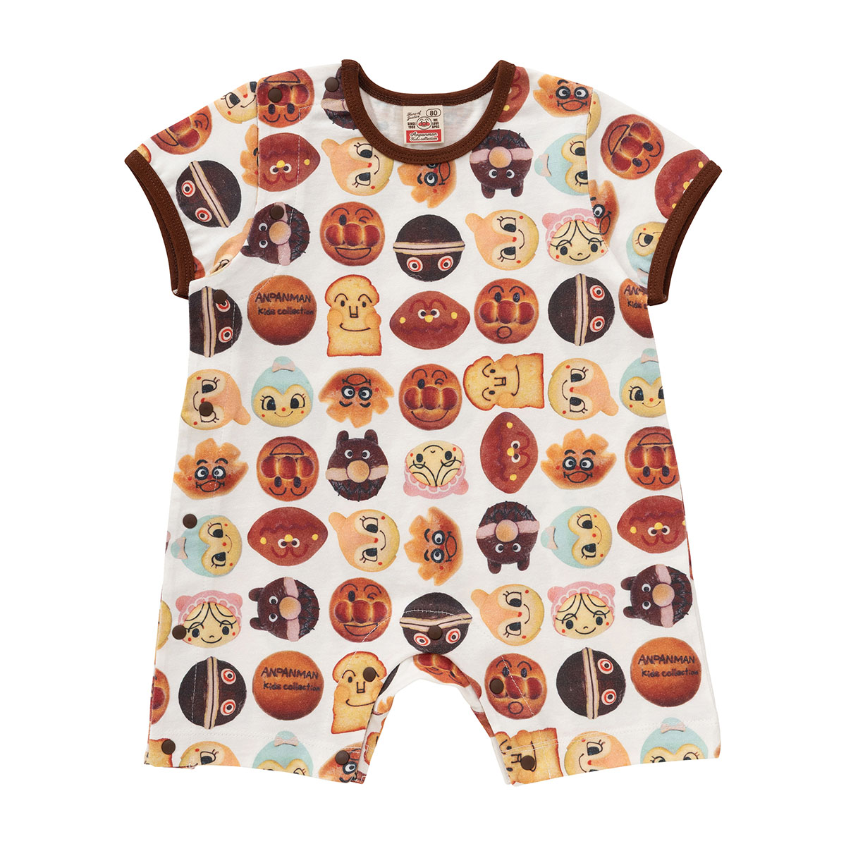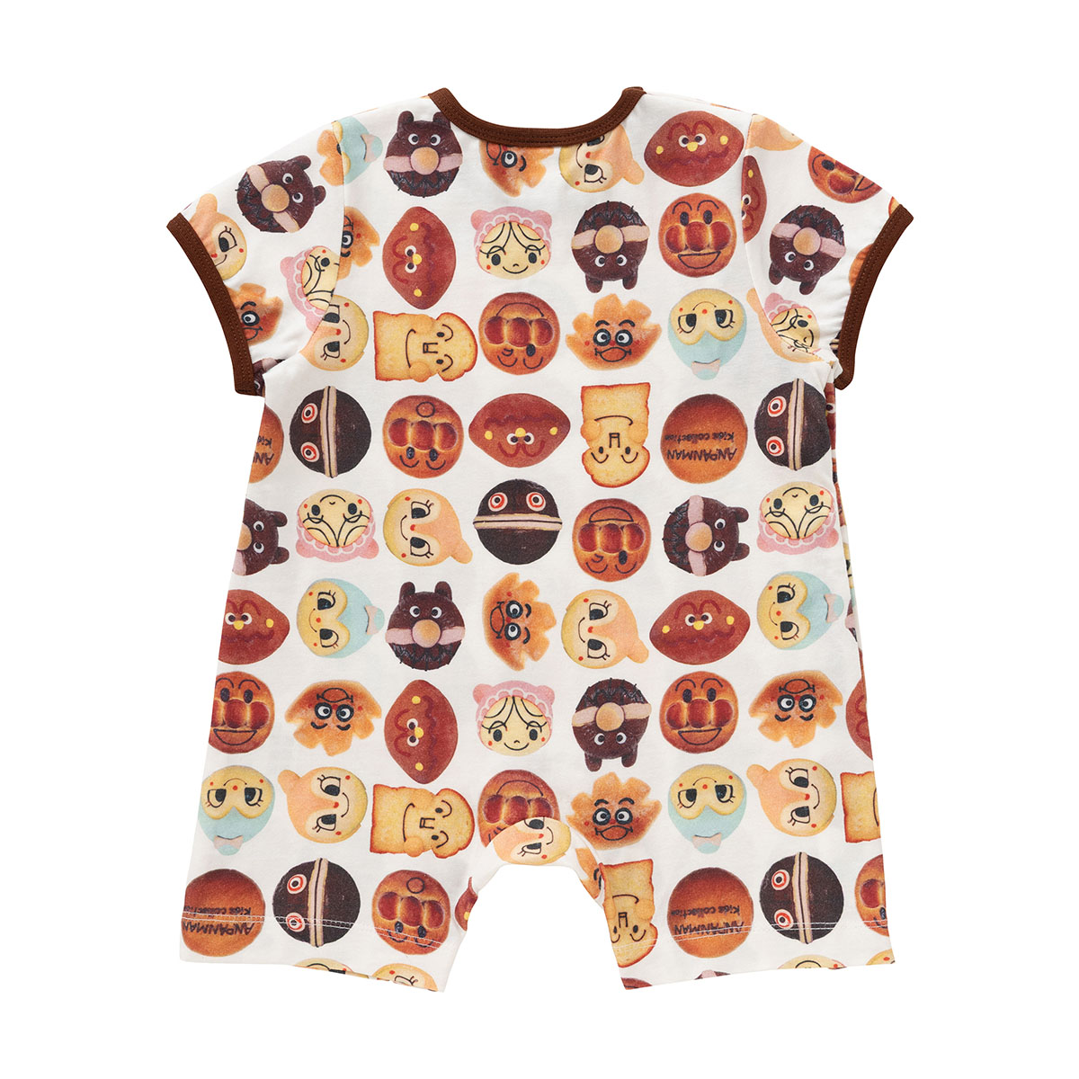アンパンマンミュージアム内のベーカリーショップ「ジャムおじさんのパン工場」で販売されている実際のキャラクターパンをデザインしたパン柄の総柄半袖ロンパース。