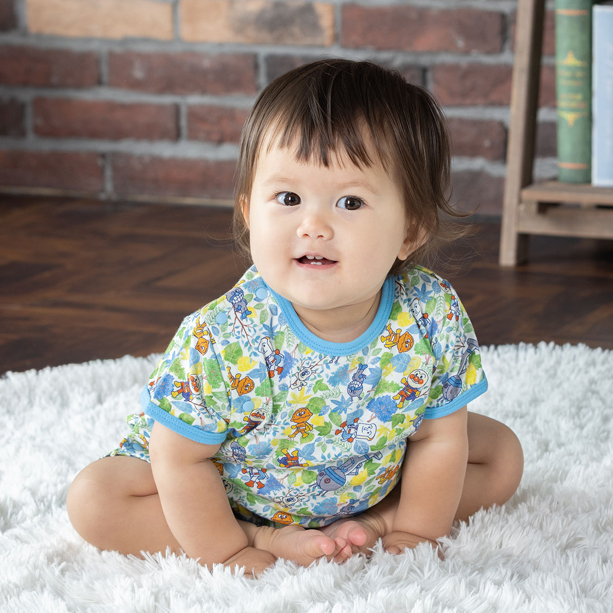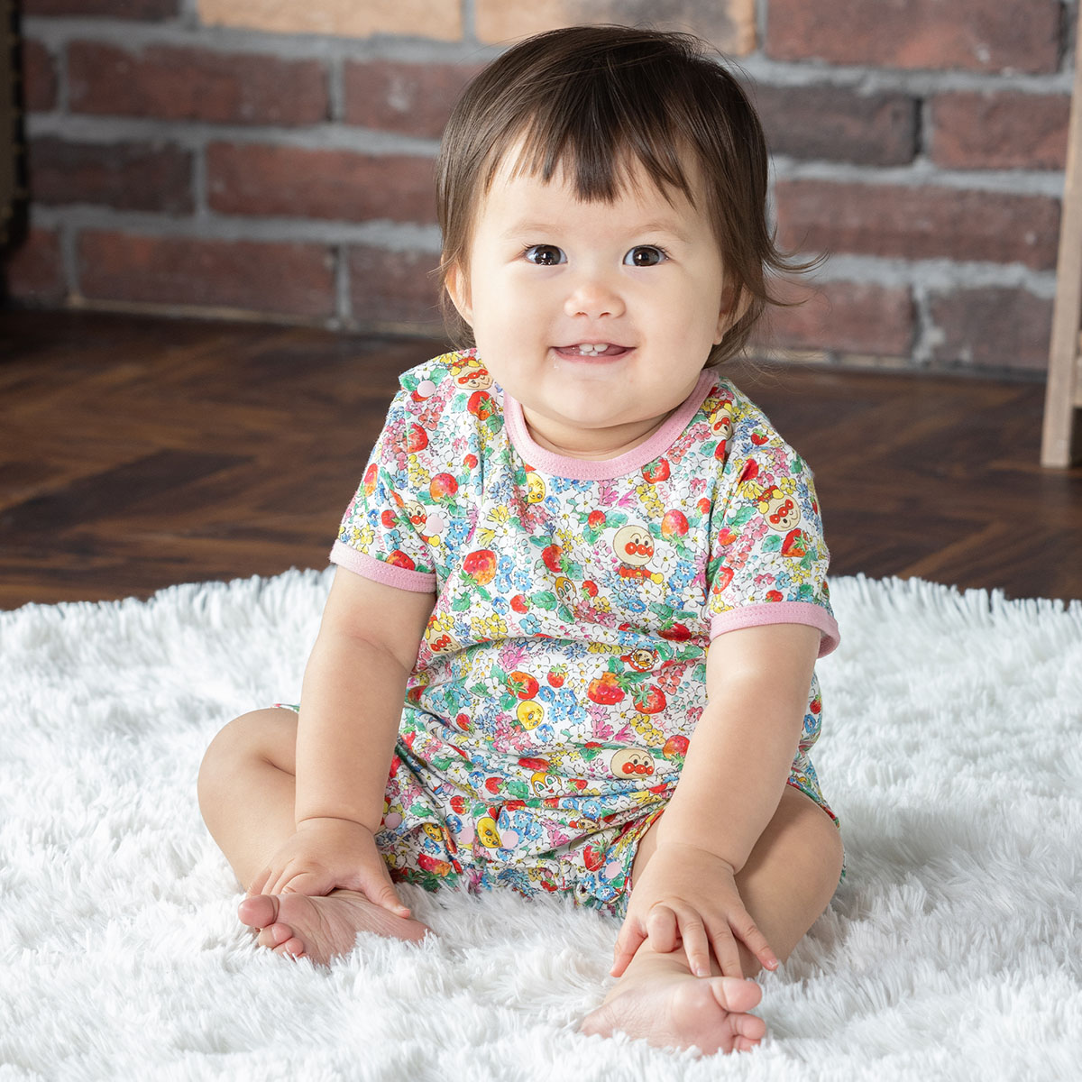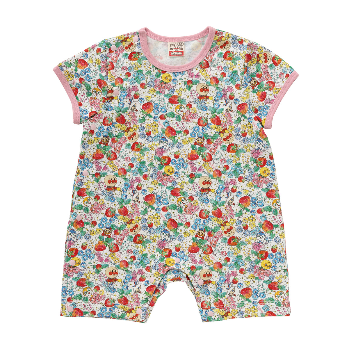 アンパンマンやあかちゃんまんたちがいちごやお花に囲まれた可愛らしいいちご総柄と、アンパンマンやばいきんまんたちが葉っぱに囲まれた爽やかなリーフ総柄の2種類のデザインです。