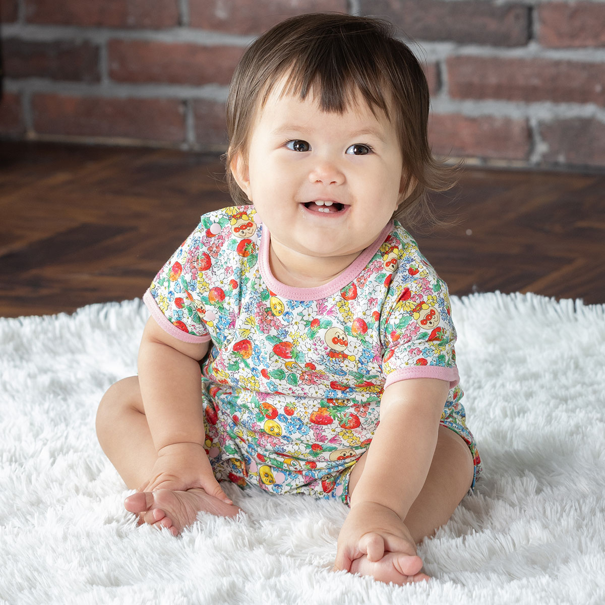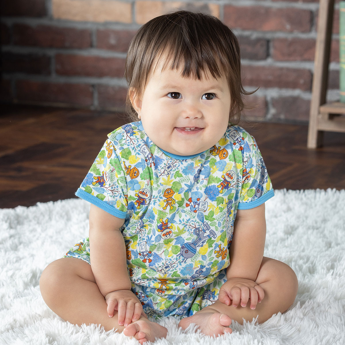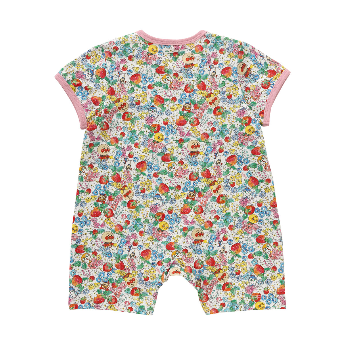 アンパンマンやあかちゃんまんたちがいちごやお花に囲まれた可愛らしいいちご総柄と、アンパンマンやばいきんまんたちが葉っぱに囲まれた爽やかなリーフ総柄の2種類のデザインです。