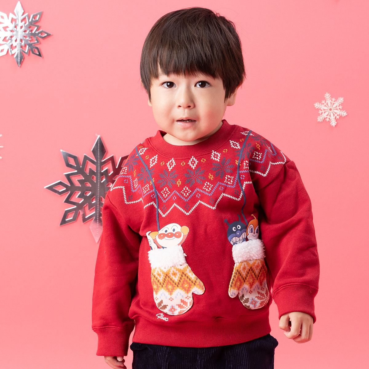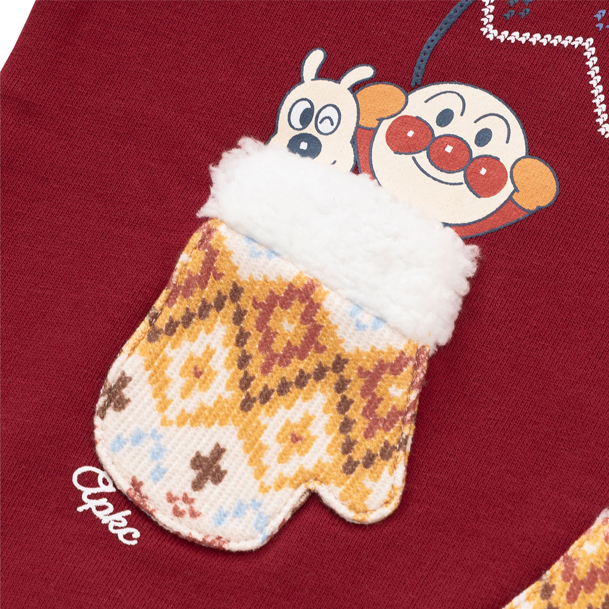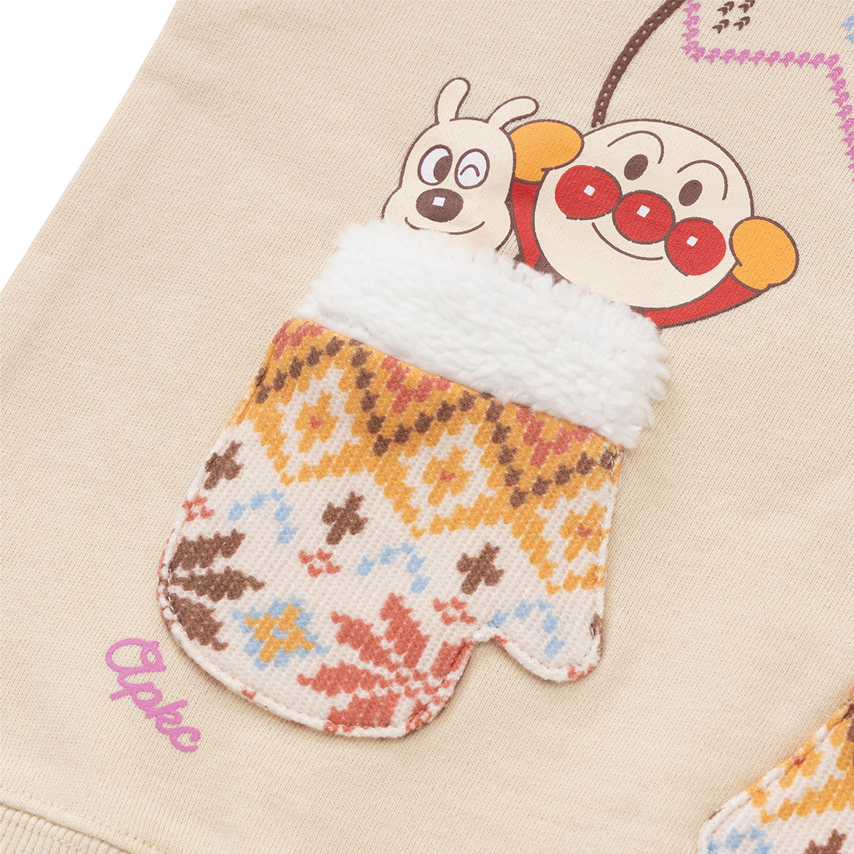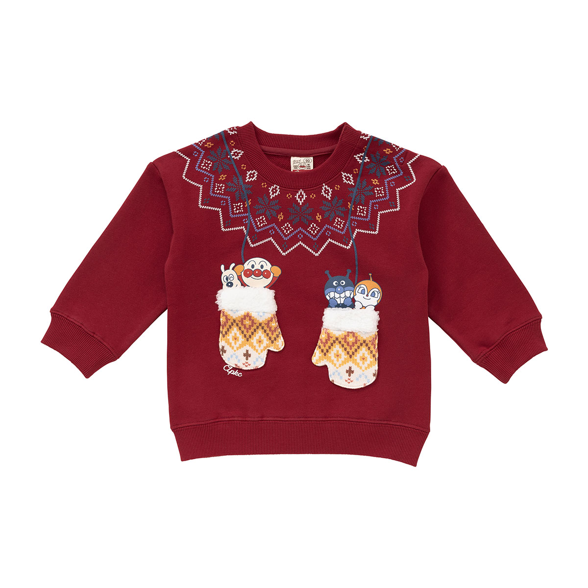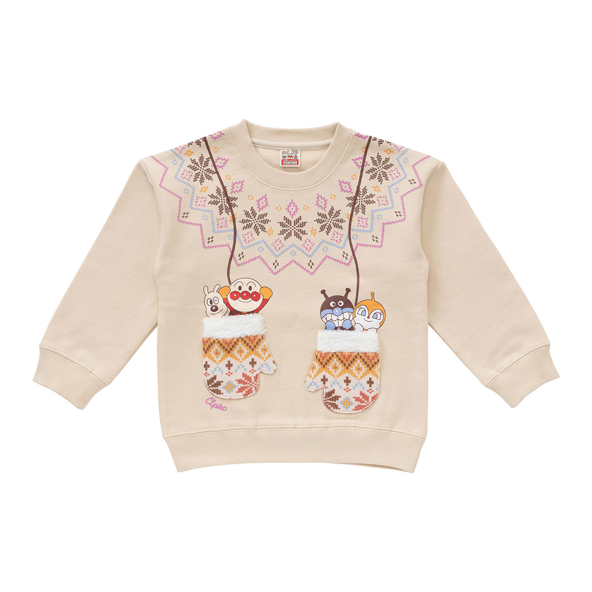 手袋からアンパンマンたちがひょっこり顔を出している遊び心いっぱいのトレーナー。