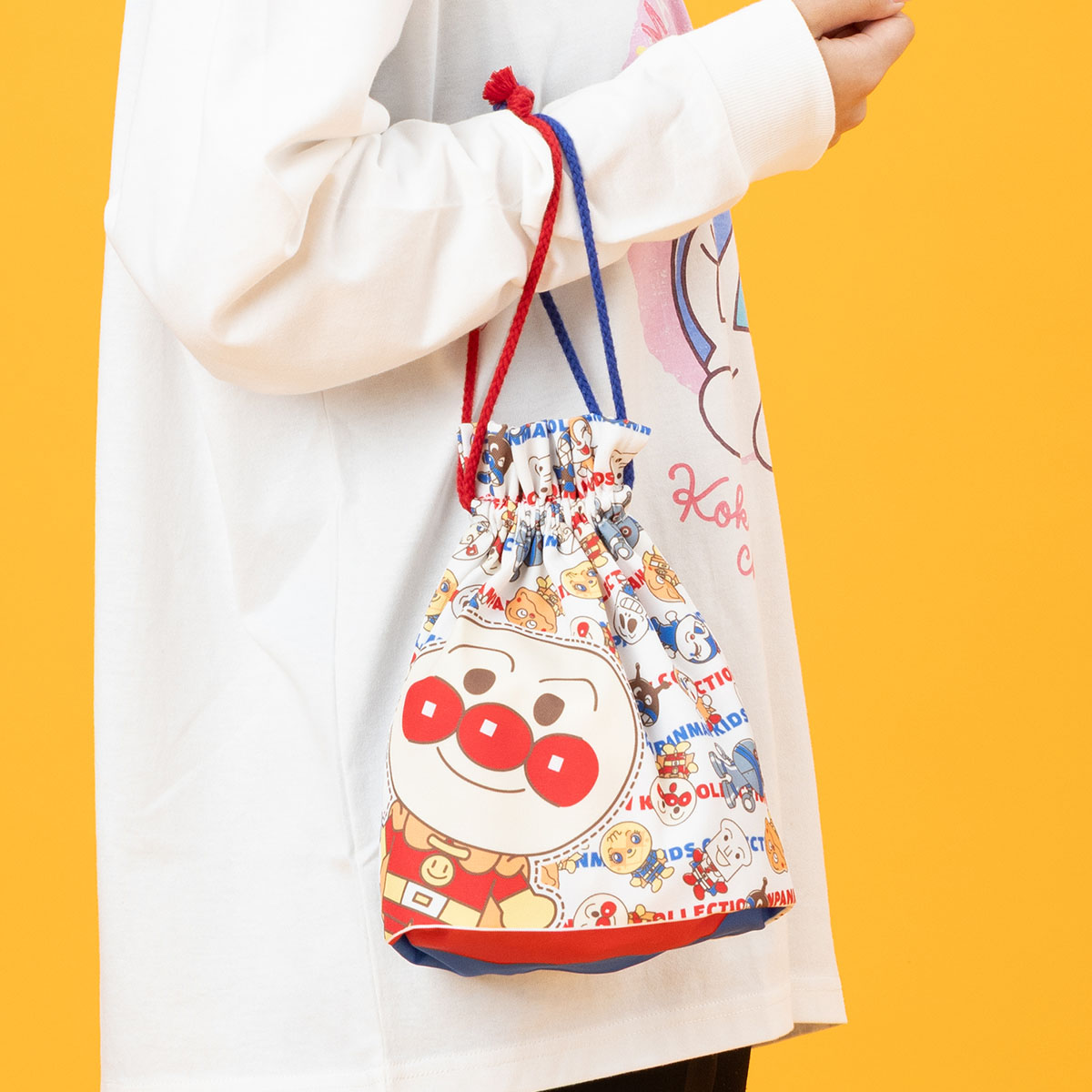 紐やマチの配色もカラフルで明るい印象の巾着です。