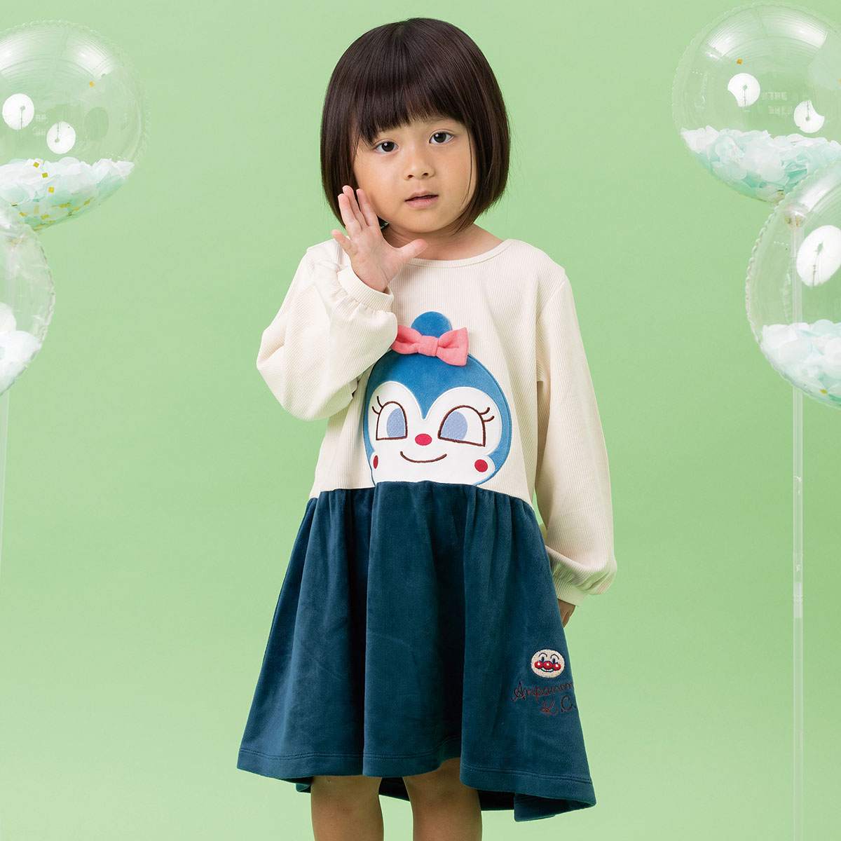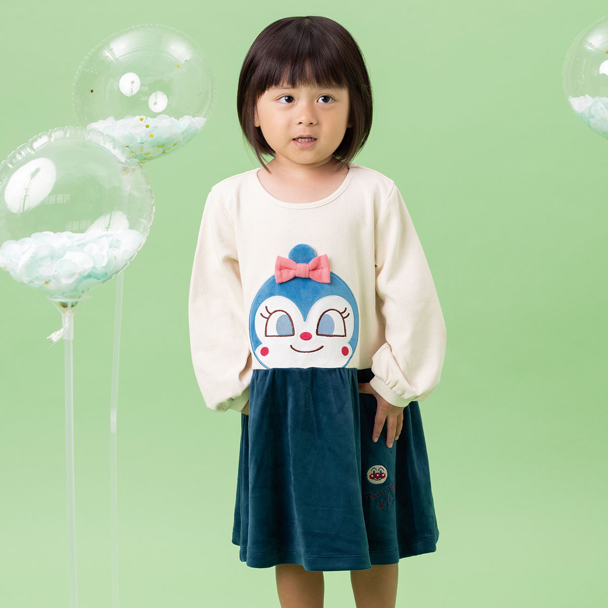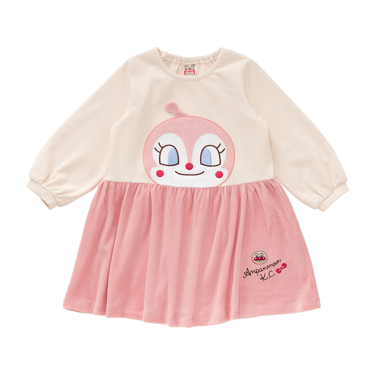 切替下のスカート部分はベロア素材を使用しており、左裾にはアンパンマンのお顔が刺繍されています。