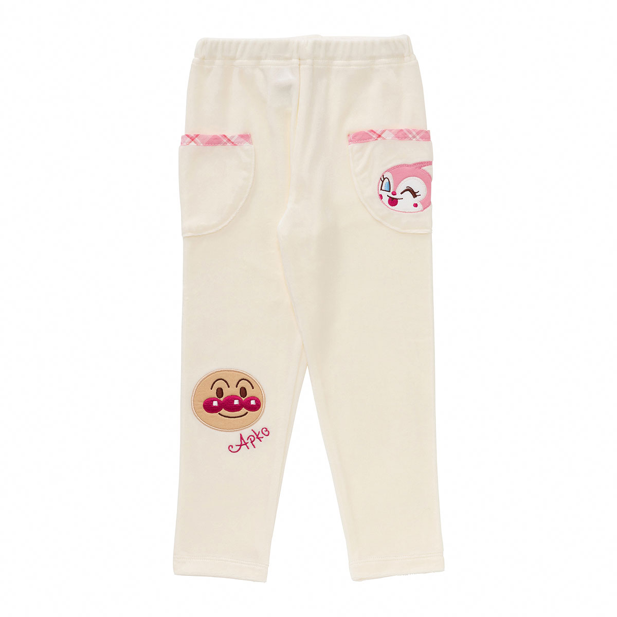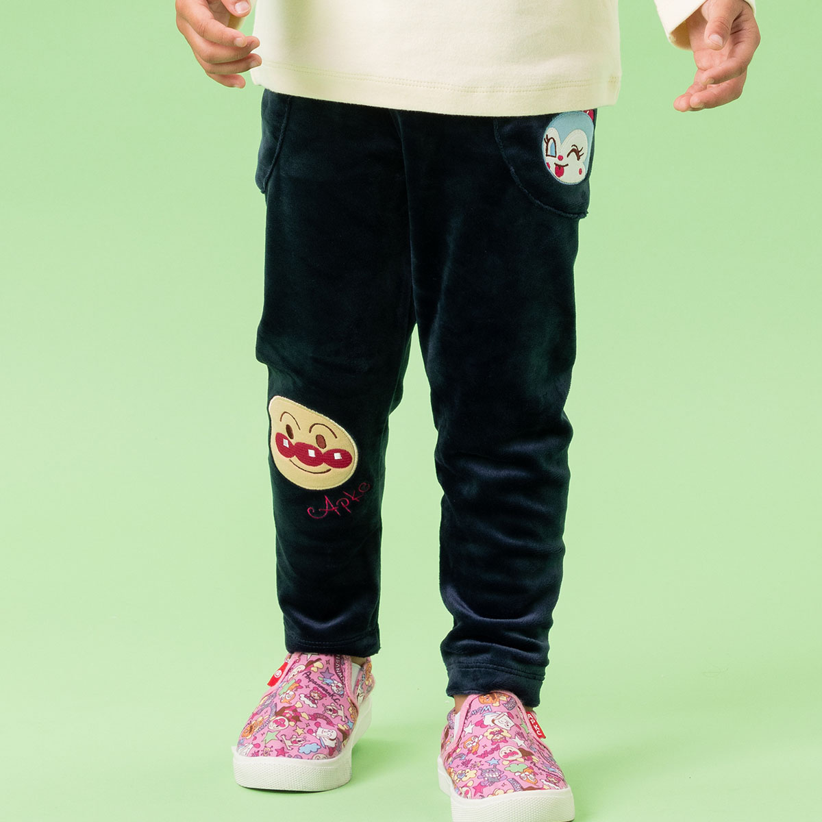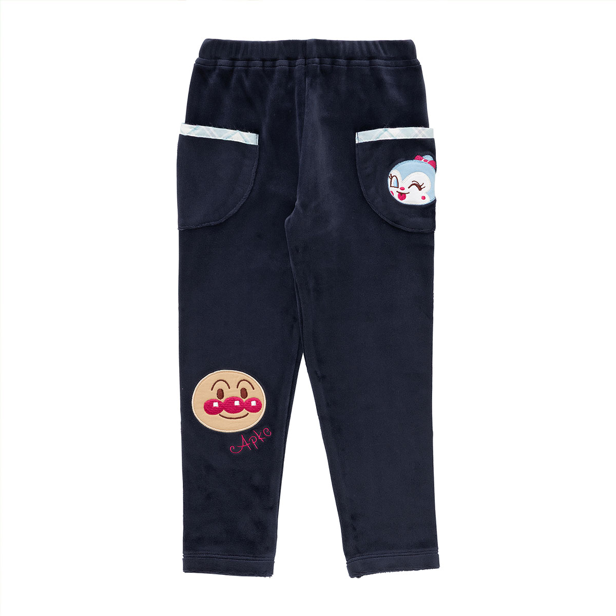 右側にアンパンマン、左ポケットにオフ白配色はドキンちゃん、ネイビー配色はコキンちゃんのお顔アップリケが施されています。