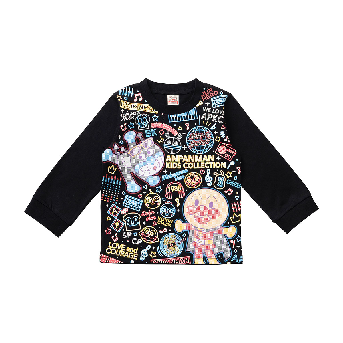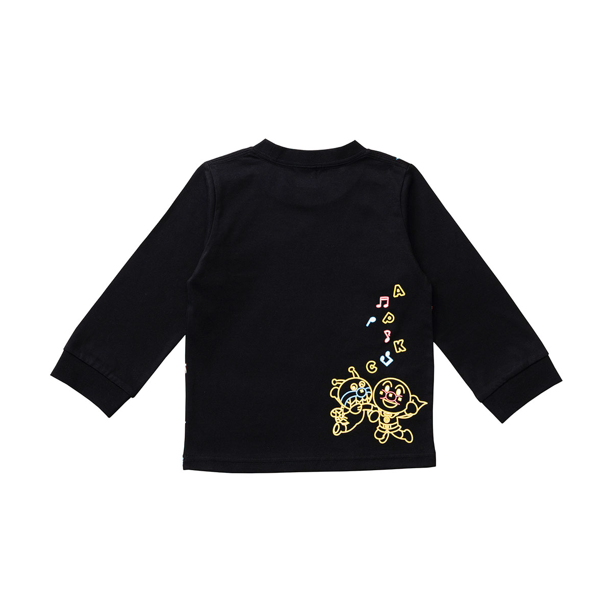 なかまたちがいっぱいデザインされた、ネオンデザインの長袖Tシャツ。ネオン風に表現されたたくさんのなかまたちと音符やレコード、ミラーボールなどの音楽モチーフが散りばめられており、着ているだけで楽しいデザイン!