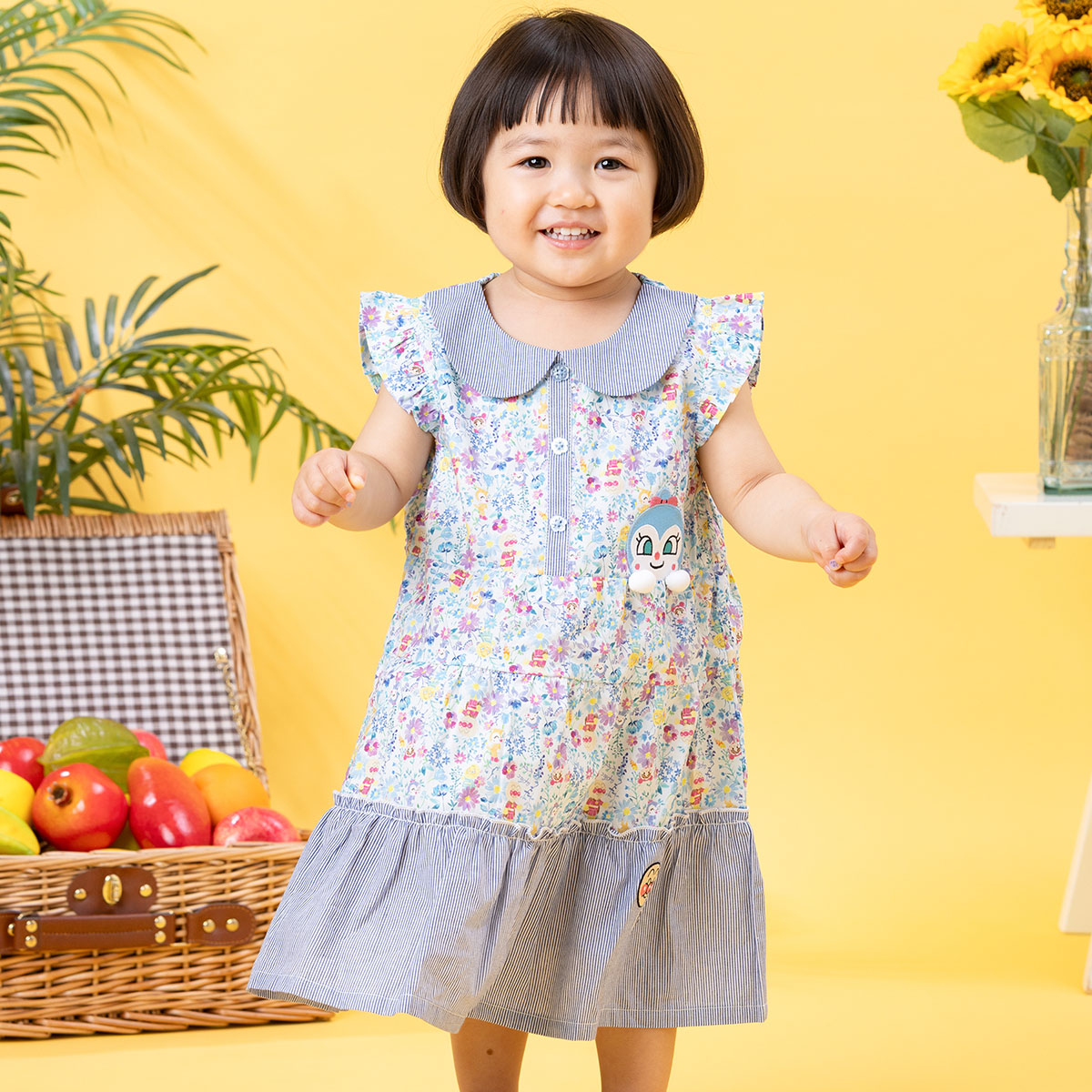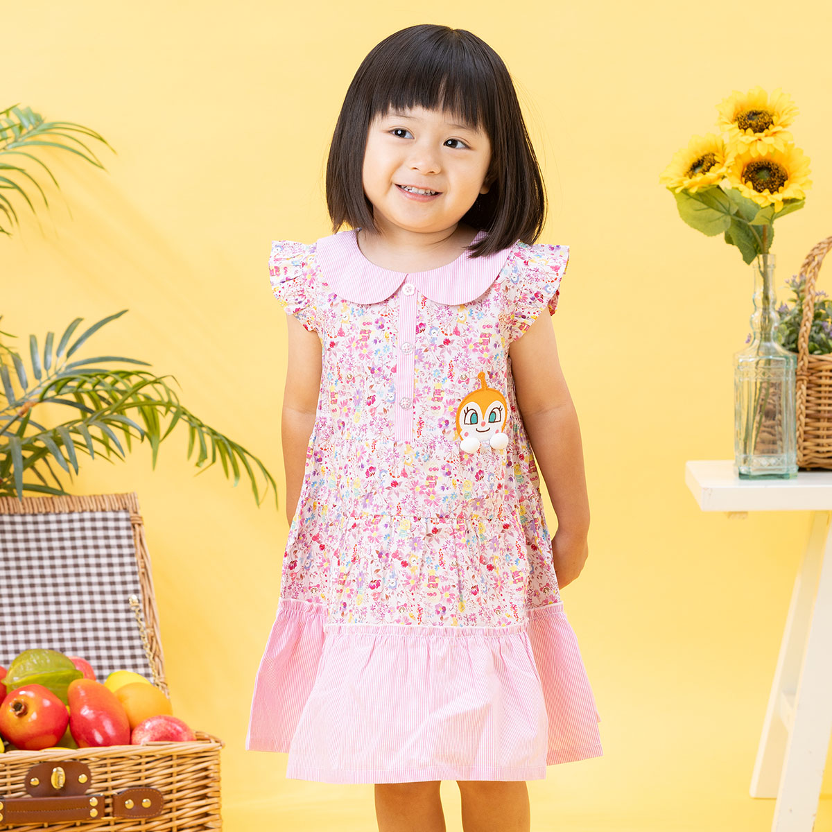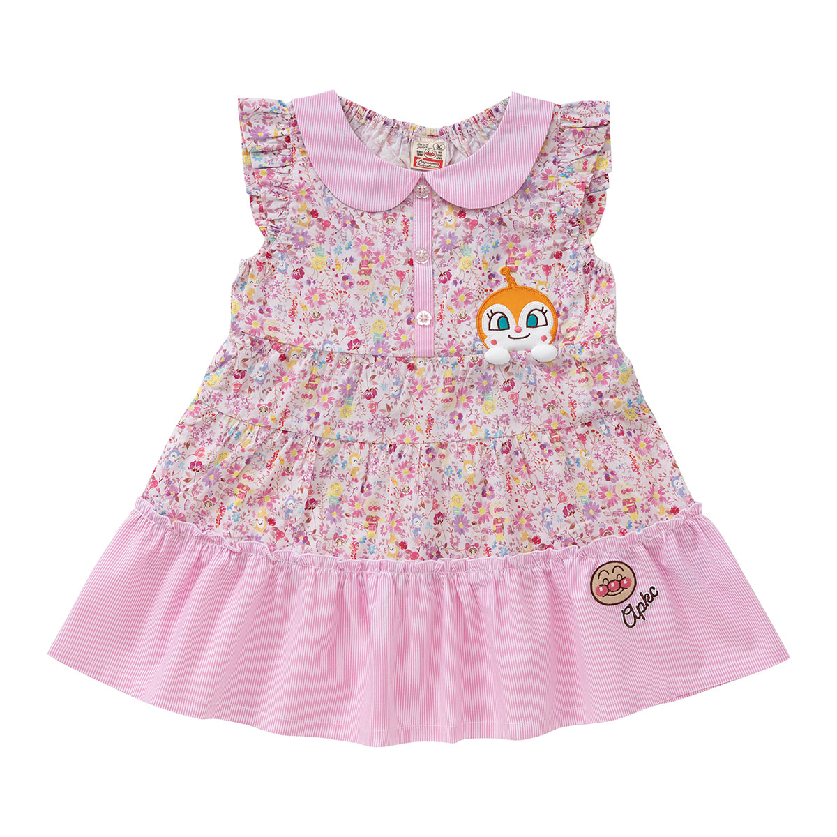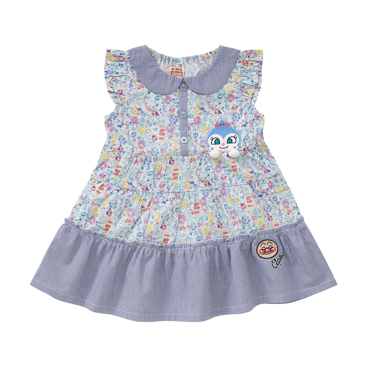 左胸にはドキンちゃんとコキンちゃんのアップリケ、裾にはアンパンマンとロゴが刺繍されています。