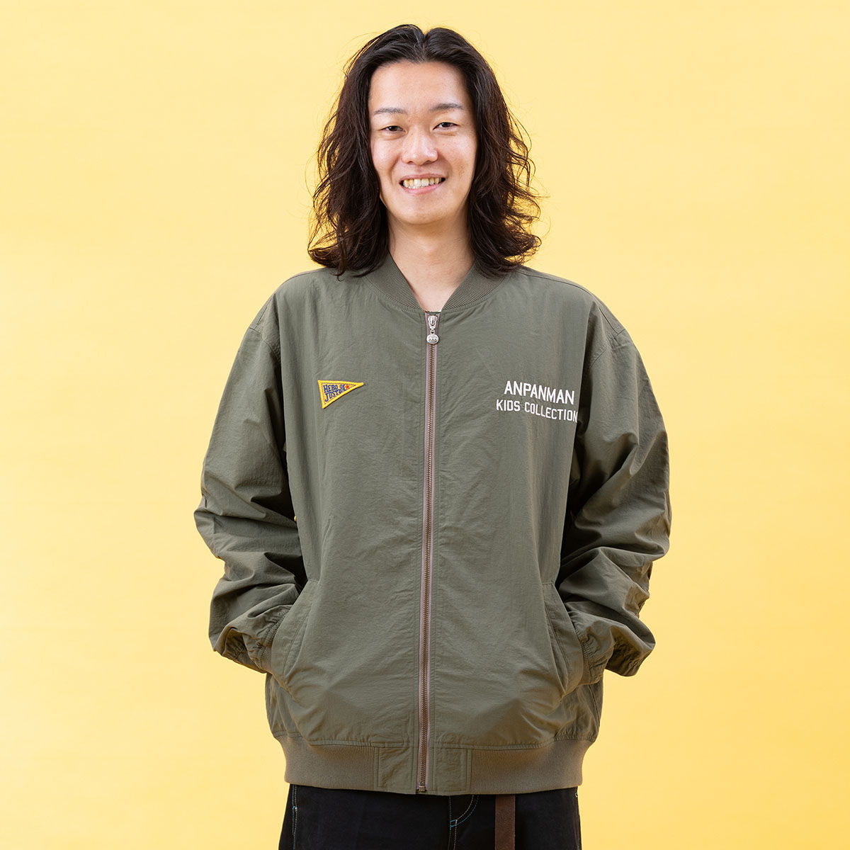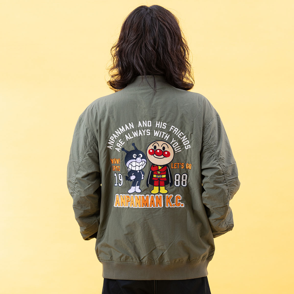 バックにアンパンマンとばいきんまんの豪華な刺繍を施した、遊び心あふれるMA-1。