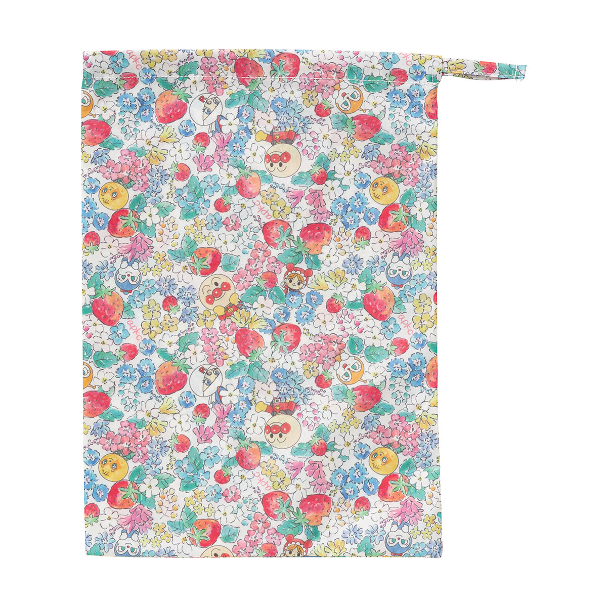 いちごとお花とアンパンマンたちの「いちご総柄」と、カラフルなAPKCロゴとアンパンマンたちの「APKC総柄」の2種類のデザインです。